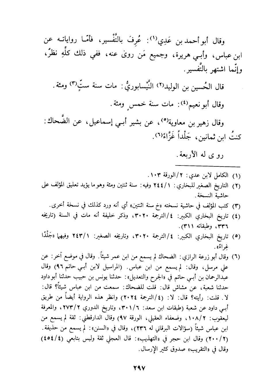 (4) تاريخ البخاري الكبير: 4 / الترجمة 3020، وذكر خليفة أنه مات في السنة (تاريخه 336، وطبقاته 311) .