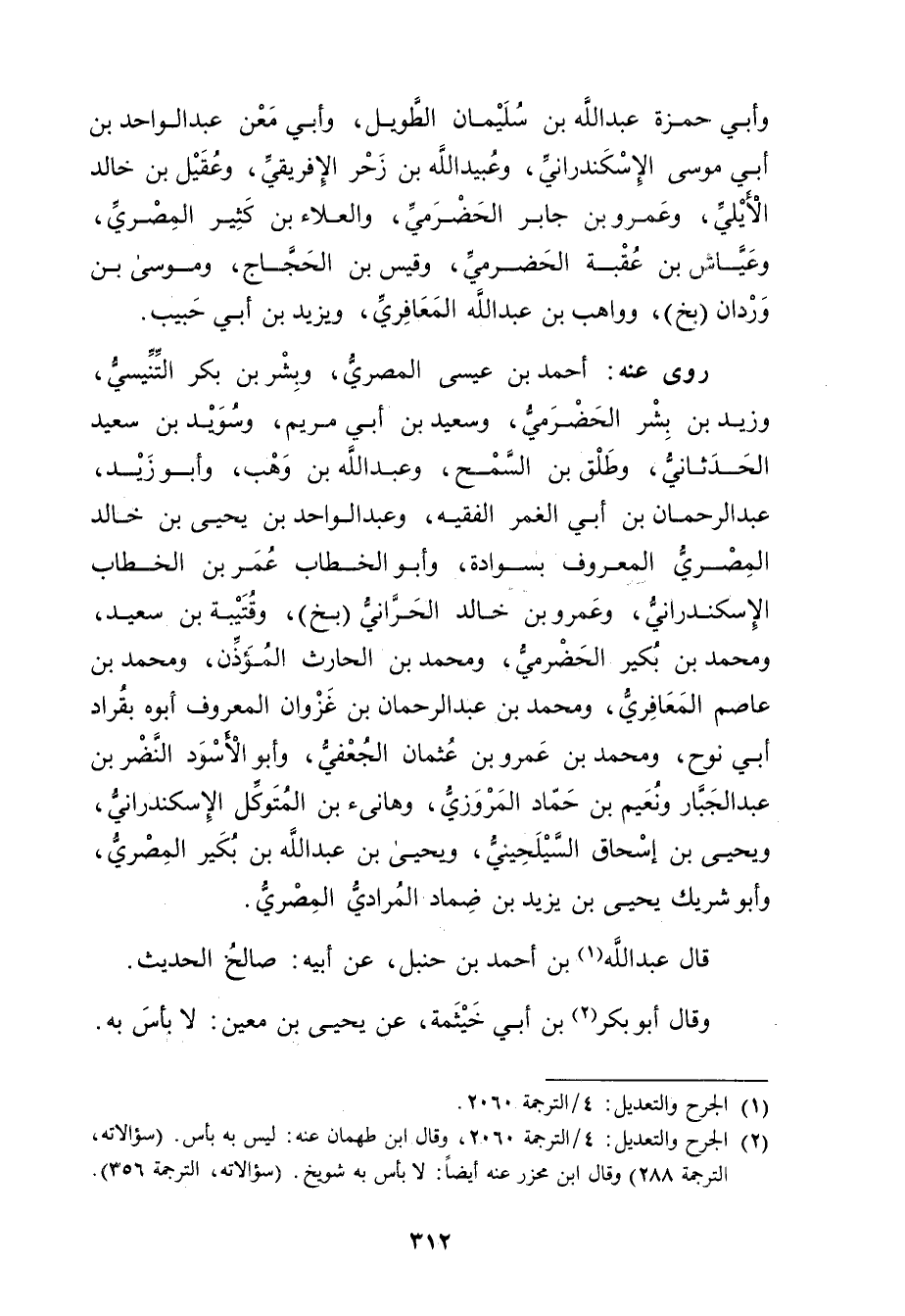 (2) الجرح والتعديل: 4 / الترجمة 2060، وَقَال ابن طهمان عَنه: ليس به بأس. (سؤالاته، الترجمة 288) وَقَال ابن محرز عنه أيضا: لا بأس به شويخ. (سؤالاته، الترجمة 356) .