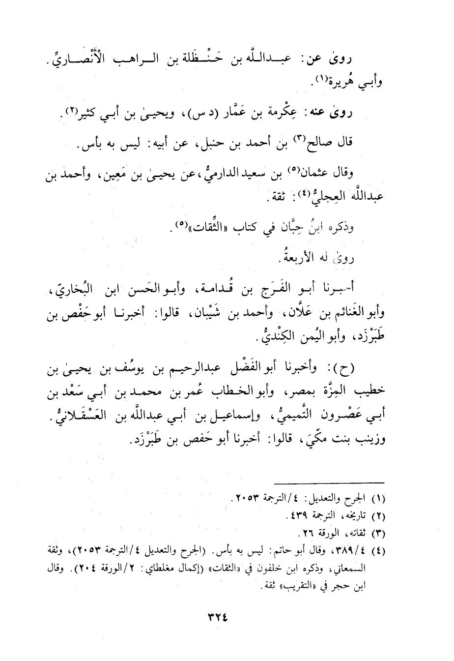 (4) 4 / 389، وَقَال أَبُو حاتم: ليس بِهِ بأس. (الجرح والتعديل 4 / الترجمة 2053) ، وثقة السمعاني، وذكره ابن خلفون في "الثقات" (إكمال مغلطاي: 2 / الورقة 204) . وَقَال ابن حجر في "التقريب"ثقة.