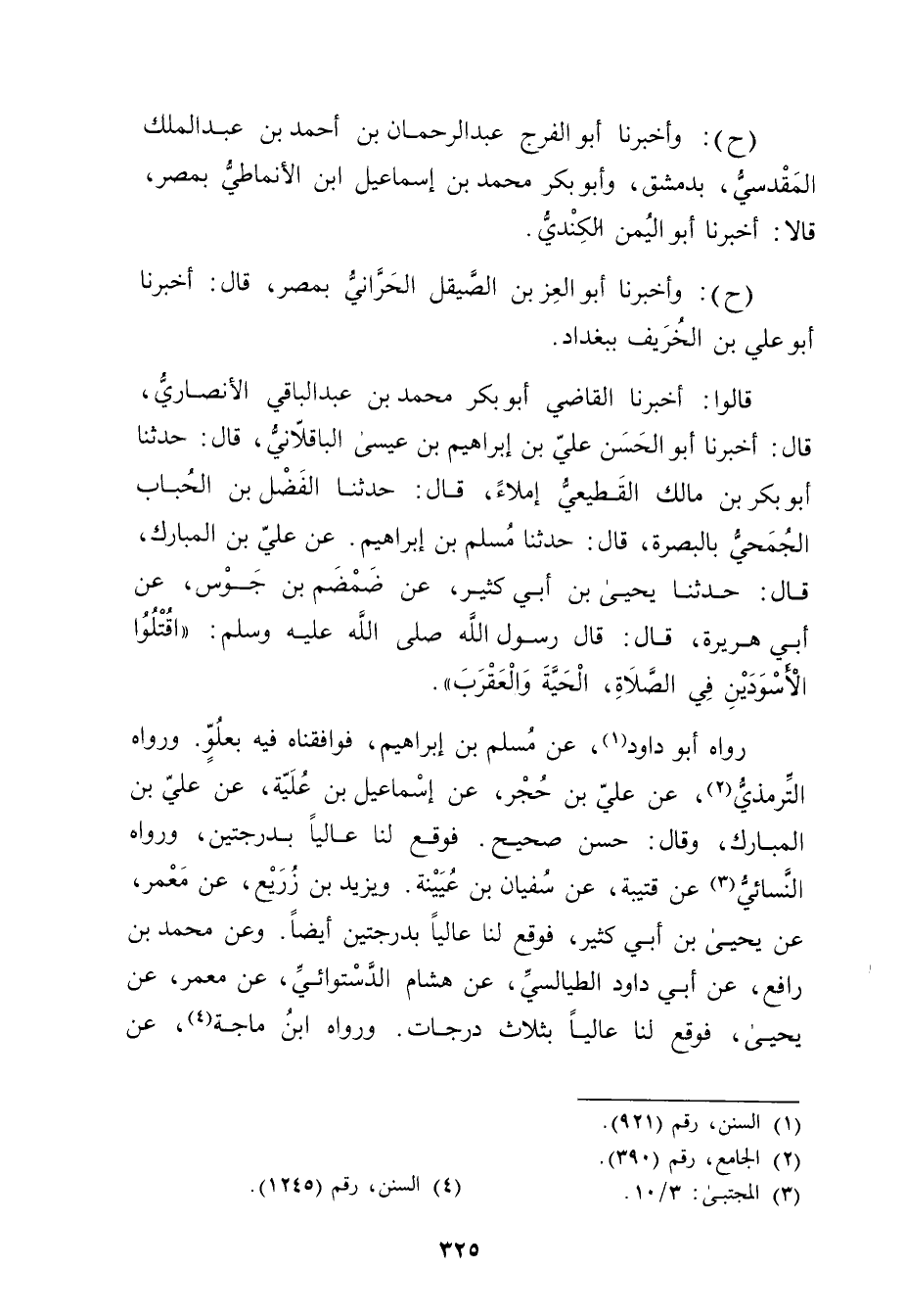 قَالُوا: أخبرنا الْقَاضِي أبو بكر محمد بن عبدا لباقي الأَنْصارِيّ، قال: أَخْبَرَنَا أَبُو الْحَسَن علي بْن إِبْرَاهِيم بْن عيسى الباقلاني، قال: حَدَّثَنَا أَبُو بَكْر بْنُ مَالِكٍ القَطِيعِيّ إِمْلاءً، قال: حَدَّثَنَا الْفَضْلُ بْنُ الْحُبَابِ الْجُمَحِيُّ بِالْبَصْرَةِ، قال: حَدَّثَنَا مُسْلِمُ بْنُ إِبْرَاهِيمَ، عَنْ عَلِيِّ بْنِ الْمُبَارَكِ، قال: حَدَّثَنَا يَحْيَى بْنُ أَبي كَثِيرٍ، عَنْ ضَمْضَمِ بْنِ جَوْسٍ، عَن أَبِي هُرَيْرة، قال: قال رَسُول اللَّهِ صلى الله عليه وسَلَّمَ: اقْتُلُوا الأَسْوَدَيْنِ فِي الصَّلاةِ، الْحَيَّةَ والْعَقْرَبَ.