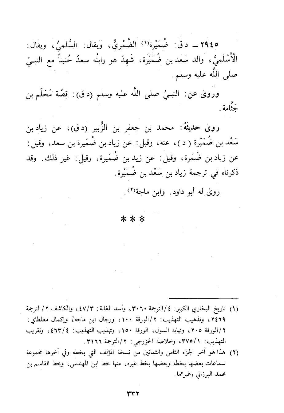 2945 - د ق: ضميرة الضمري (1) ، ويُقال: السلمي، ويُقال: الأَسلميّ، والد سعد بن ضميرة، شهد هو وابنه سعد حنينا مع النبي صَلَّى اللَّهُ عَلَيْهِ وسَلَّمَ.