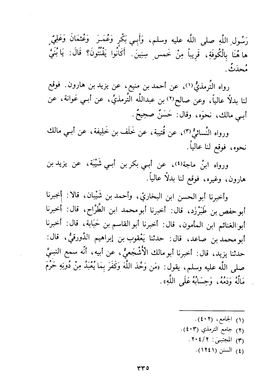 رواه التِّرْمِذِيّ (1) ، عن أَحْمَدَ بْنِ مَنِيعٍ، عَنْ يزيد بْن هارون. فوقع لنا بدلا عاليا، وعن صالح (2) بن عَبد الله التِّرْمِذِيّ، عَن أبي عوانة، عَن أبي مالك، نحوه، وَقَال: حسن صحيح.