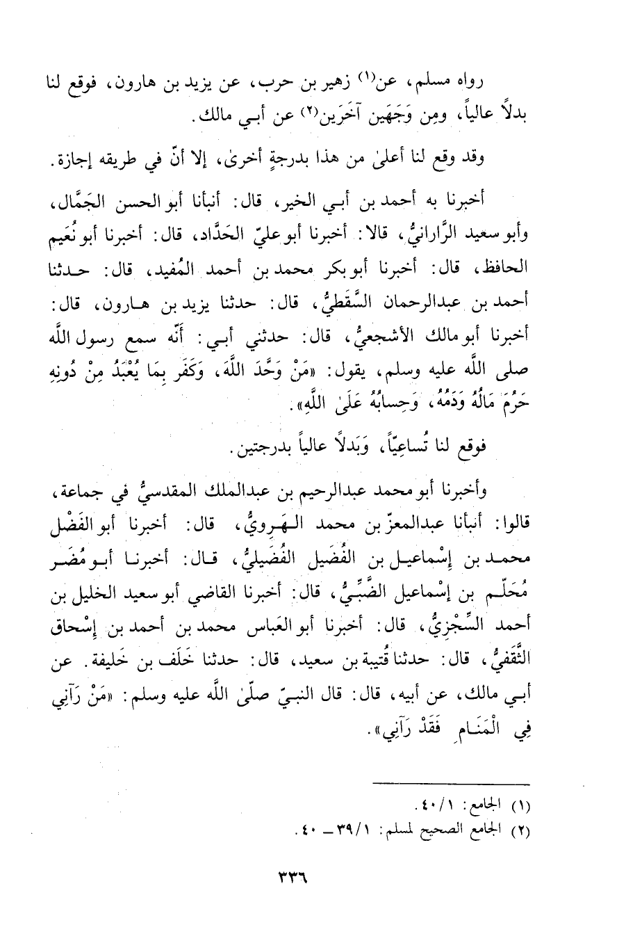 رَوَاهُ مُسْلِمٌ، عَنْ (1) زُهَيْرِ بْنِ حَرْبٍ، عَنْ يَزِيدَ بْنِ هارون، فوقع لنا بدلا عاليا، ومِنْ وجْهَيْنِ آخَرَيْنِ (2) عَن أَبِي مَالِكٍ.