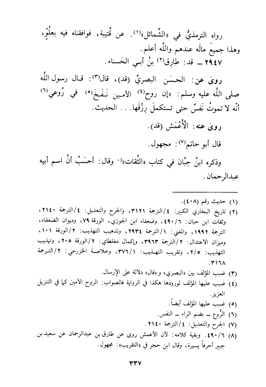 (8) 6 / 490. وبقية كلامه: لان الأعمش روى عن طارق بن عبد الرحمن عن سَعِيد بن جبير أحرفا يسيرة، وَقَال ابن حجر في "التقريب": مجهول.
