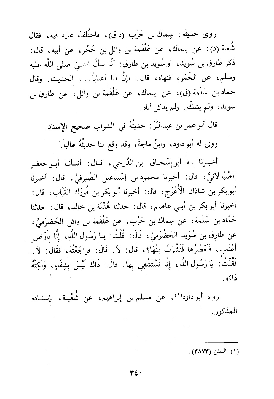 أَخْبَرَنَا بِهِ أَبُو إِسْحَاقَ ابْنُ الدَّرَجِيِّ، قال: أنبأنا أَبُو جَعْفَرٍ الصَّيْدَلانِيُّ، قال: أَخْبَرَنَا مَحْمُودُ بْنُ إِسْمَاعِيلَ الصَّيْرَفِيُّ، قال: أَخْبَرَنَا أَبُو بَكْرِ بْنُ شَاذَانَ الأَعْرَجُ، قال: أَخْبَرَنَا أَبُو بَكْرِ بْنُ فُوُرَكَ الْقَبَّابُ، قال: أَخْبَرَنَا أبو بكر بْن أَبي عاصم، قال: حَدَّثَنَا هدبه بْنُ خَالِدٍ، قال: حَدَّثَنَا حَمَّادُ بْن سلمة، عَنْ سماك بْن حَرْبٍ، عَنْ عَلْقَمَةَ بْنِ وائِلٍ الْحَضْرَمِيِّ، عَنْ طَارِقِ بْنِ سُوَيْدٍ الْحَضْرَمِيِّ، قال: قُلْتُ: يَا رَسُولَ اللَّهِ، إِنَّا بِأَرْضِ أَعْنَابٍ، فَنَعْصُرُهَا فَنَشْرَبُ مِنْهَا؟ ، قال: لا. قال: فَرَاجَعْتُهُ، فَقَالَ: لا. فَقُلْتُ: يَا رَسُولَ اللَّهِ، إِنَّا نَسْتَشْفِي بِهَا. قال: ذَاكَ لَيْسَ بِشِفَاءٍ، ولَكِنَّهُ دَاءٌ.