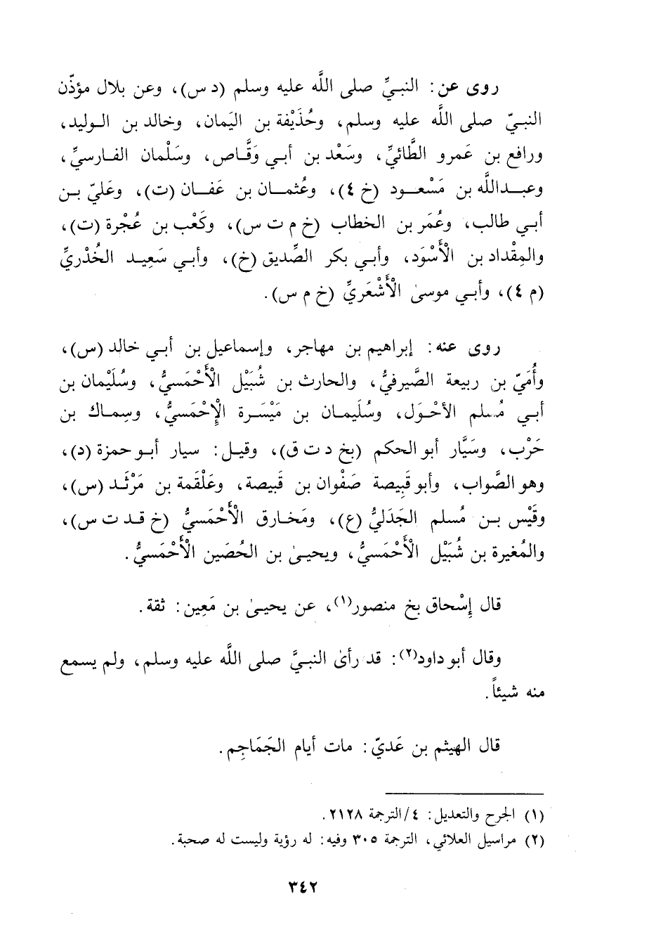 (2) مراسيل العلائي، الترجمة 305 وفيه: له رؤية وليست لهُ صُحبَةٌ.