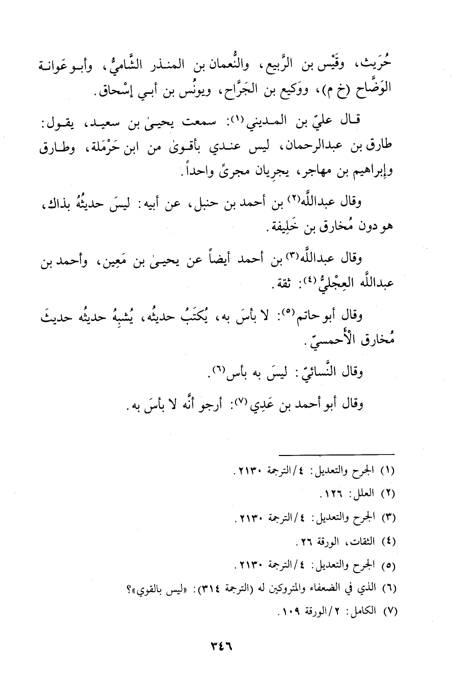 (6) الذي في الضعفاء والمتروكين له (الترجمة 314) : ليس بالقوي"؟ (7) الكامل: 2 / الورقة 109.
