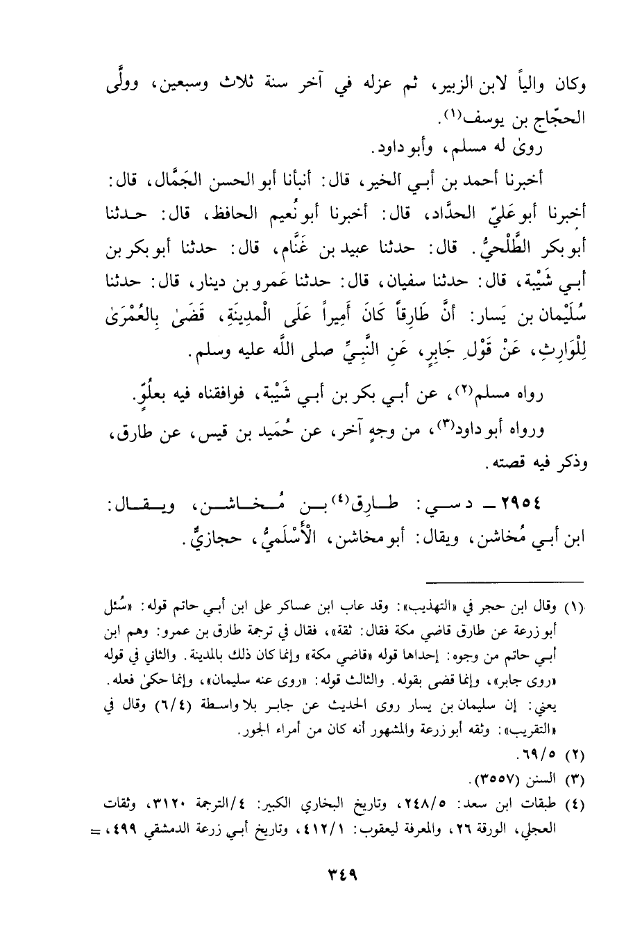 (1) وَقَال ابن حجر في "التهذيب": وقد عاب ابن عساكر على ابن أَبي حاتم قوله: سئل أبو زُرْعَة عن طارق قاضي مكة فقال: ثقة"، فقال في ترجمة طارق بن عَمْرو: وهم ابن أَبي حاتم من وجوه: إحداها قوله"قاضي مكة"وإنما كان ذلك بالمدينة. والثاني في قوله"روى جابر"، وإنما قضى بقوله. والثالث قوله: روى عنه سُلَيْمان"، وإنما حكى فعله. يعني: إن سُلَيْمان بن يسار روى الحديث عن جابر بلا واسطة (4 / 6) وَقَال في "التقريب": وثقه أبو زُرْعَة والمشهور أنه كان من أمراء الجور.