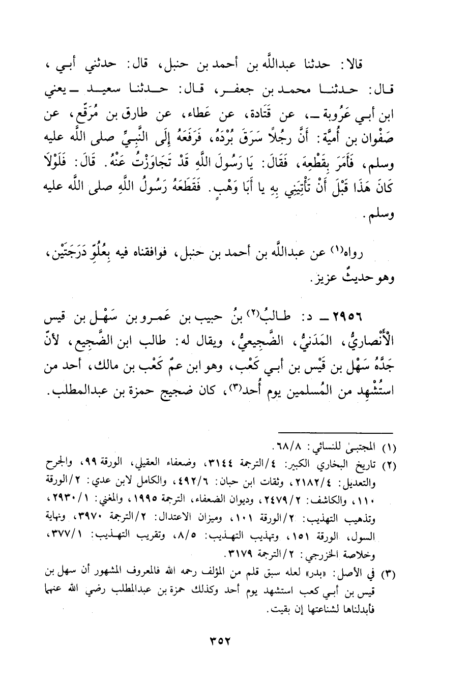 قالا: حَدَّثَنَا عَبد اللَّهِ بْنُ أحمد بْن حنبل، قال: حَدَّثني أَبِي، قال: حَدَّثَنَا مُحَمَّدُ بْنُ جَعْفَرٍ، قال: حَدَّثَنَا سَعِيد، يَعْنِي ابن أَبي عَرُوبَة، عَنْ قتادة، عَنْ عَطَاءٍ، عَنْ طَارِقِ بْنِ مُرَقَّعٍ، عَنْ صَفْوَانَ بْنِ أُمَيَّةَ: أَنَّ رَجُلا سَرَقَ بُرْدَهُ، فَرَفَعَهُ إِلَى النَّبِيّ صَلَّى اللَّهُ عَلَيْهِ وسَلَّمَ، فَأَمَرَ بِقَطْعِهِ، فَقَالَ: يَا رَسُولَ اللَّهِ قَدْ تَجَاوَزْتُ عَنْهُ. قال: فَلَوْلا كَانَ هَذَا قَبْلَ أَنْ تَأْتِيَنِيَ بِهِ يَا أَبَا وهْبٍ. فَقَطَعَهُ رَسُولُ اللَّهِ صَلَّى اللَّهُ عَلَيْه وسَلَّمَ.