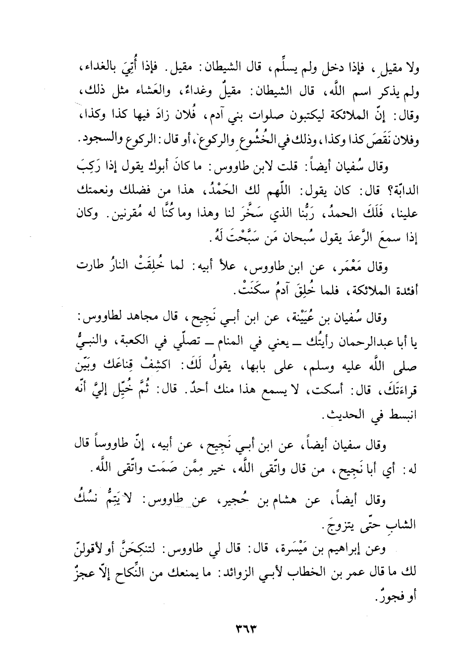 وعن إبراهيم بن ميسرة، قال: قال لي طاووس: لتنكحن أو لأقولن لك ما قال عُمَر بن الخطاب لأبي الزوائد: ما يمنعك من النكاح إلا عجز أو فجور.
