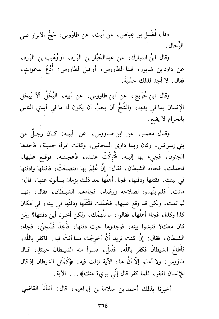 وَقَال ابن المبارك، عن عبد الجبار بن الورد، أو وهيب بن الورد، عن داود بن شابور، قلنا لطاووس، أو قيل لطاووس: أدع بدعوات، فقال: لا أجد لذلك حسبة.