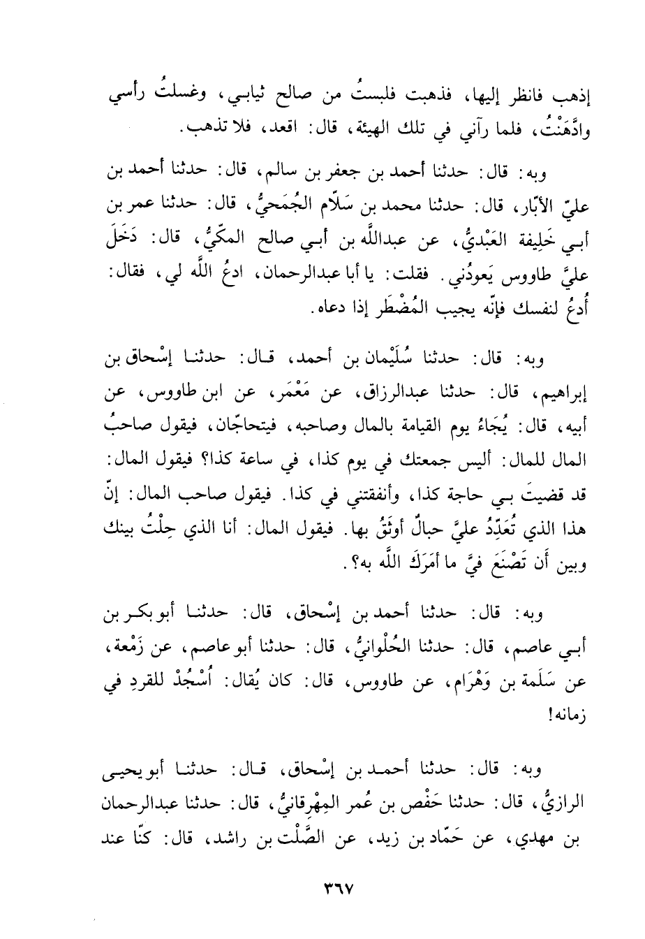 وبه: قال: حَدَّثَنَا أَحْمَدُ بْنُ جعفر بن سالم، قال: حَدَّثَنَا أَحْمَدُ بْنُ عَلِيٍّ الأبار، قال: حَدَّثَنَا محمد بن سلام الجمحي، قال: حَدَّثَنَا عُمَر بن أَبي خليفة العبدي، عن عَبد الله بن أَبي صالح المكي، قال: دخل علي طاووس يعودني. فقلت: يا أبا عبد الرحمن، ادع الله لي، فقال: ادع لنفسك فإنه يجيب المضطر إذا دعاه.