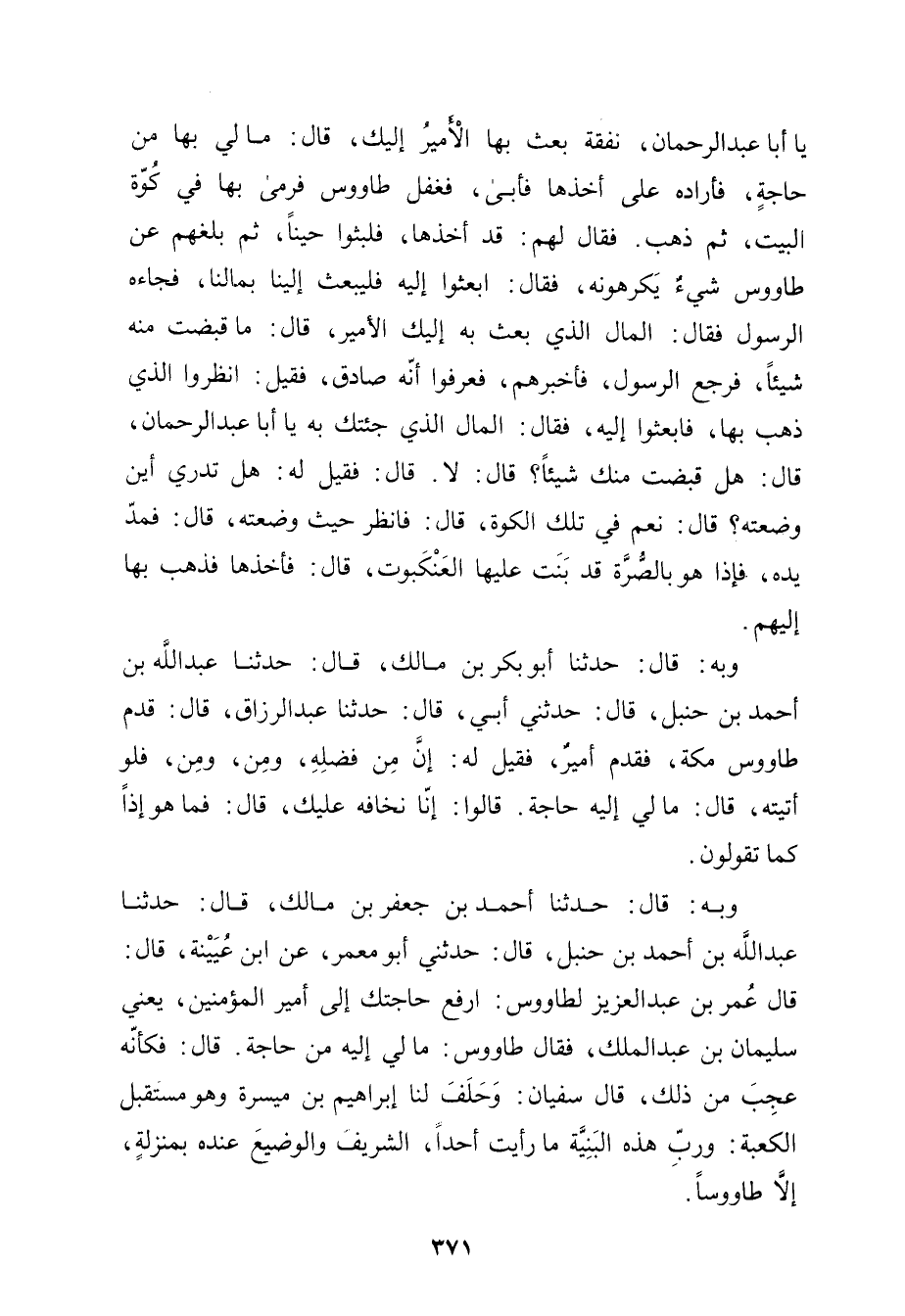 وبه: قال: حَدَّثَنَا أَحْمَدُ بْنُ جَعْفَرِ بْنِ مَالِكٍ، قال: حَدَّثَنَا عَبد اللَّهِ بْن أحمد بْن حنبل، قال: حدثني أبو معمر، عن ابن عُيَيْنَة، قال: قال عُمَر بْن عبد العزيز لطاووس: ارفع حاجتك إلى أمير المؤمنين، يعني سُلَيْمان بْن عَبد المَلِك، فقال طاووس: مالي إليه من حاجة. قال: فكأنه عجب من ذلك، قال سفيان: وحلف لنا إبراهيم بن ميسرة وهو مستقبل الكعبة: ورب هذه البنية ما رأيت أحدا، الشريف والوضيع عنده بمنزلة إلا طاووساً.