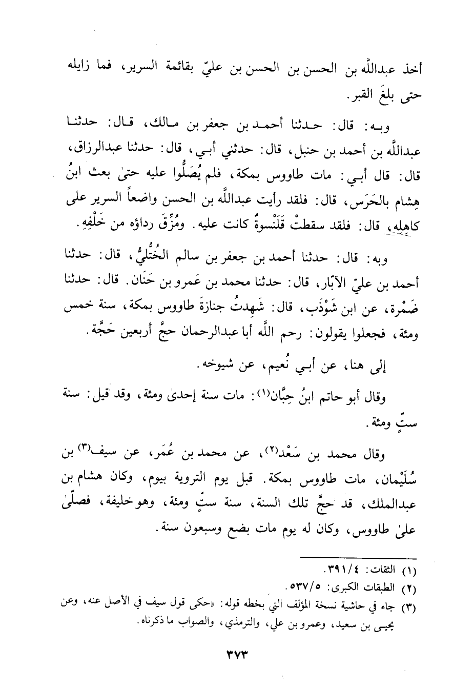 وبه: قال: حَدَّثَنَا أحمد بْنُ جَعْفَرِ بْنِ مَالِكٍ، قال: حَدَّثَنَا عَبد اللَّهِ بْنُ أَحْمَدَ بْن حنبل، قال: حَدَّثني أبي، قال: حَدَّثَنَا عَبْدُ الرَّزَّاقِ، قال: قال أبي: مات طاووس بمكة، فلم يصلوا عليه حتى بعث ابن هشام بالحرس، قال: فلقد رأيت عَبد الله بن الحسن واضعا السرير على كاهله، قال: فلقد سقطت قلنسوة كانت عليه. ومزق رداؤه من خلفه.