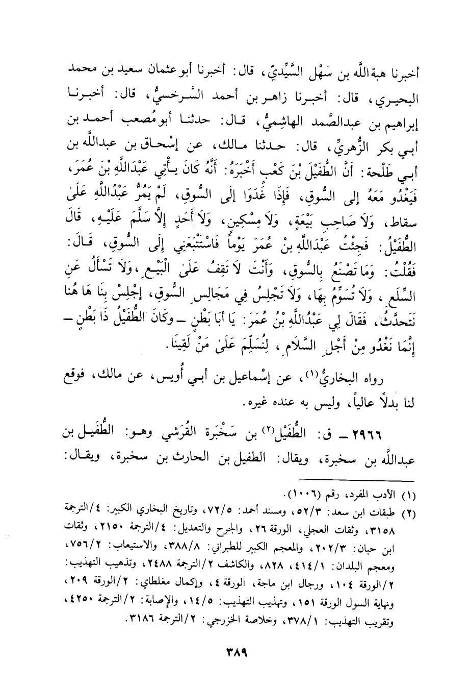 أَخْبَرَنَا هِبَة اللَّهِ بْنُ سَهْلٍ السيدي، قال: أَخْبَرَنَا أَبُو عثمان سَعِيد بْنُ مُحَمَّدٍ الْبُحَيْرِيُّ، قال: أخبرنا زَاهِرُ بْنُ أَحْمَدَ السَّرْخَسِيُّ، قال: أخبرنا إِبْرَاهِيمُ بْنُ عَبْدِ الصَّمَدِ الْهَاشِمِيُّ، قال: حَدَّثَنَا أَبُو مصعب أَحْمَد بْن أَبي بَكْر الزُّهْرِيّ، قال: حَدَّثَنَا مالك، عن إسحاق بْن عَبد الله بْن أَبي طلحة: أن الطفيل بن كعب أخبره: أنه كان يأتي عَبد الله بن عُمَر، فيغدو معه إلى السوق، فإذا غدوا إلى السوق، لم يمر عَبد الله على سقاط، ولا صاحب بيعة، ولا مسكين، ولا أحد إلا سلم عليه، قال الطفيل: فجئت عَبد الله بن عُمَر يوما فاستتبعني إلى السوق، قال: فقلت: وما تصنع بالسوق، وأنت لا تقف على البيع، ولا تسأل عن السلع، ولا تسوم بها، ولا تجلس في مجالس السوق، اجلس بنا هاهنا نتحدث، فقالا لي عَبد اللَّهِ بْن عُمَر: يا أبا بطن - وكان الطفيل ذا بطن - إنما نغدو من أجل السلام، لنسلم على من لقينا.