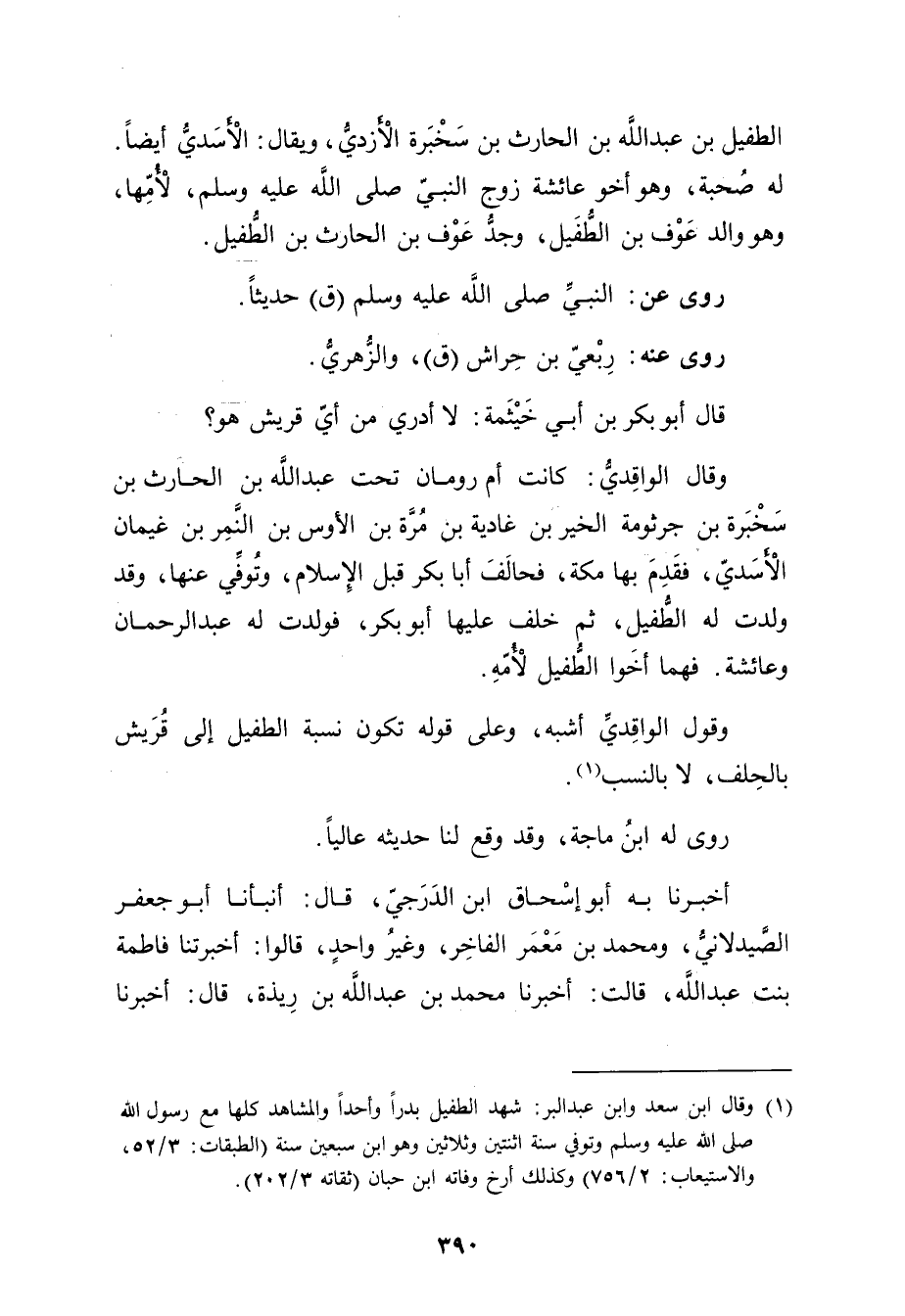 (1) وَقَال ابن سعد وابن عَبد الْبَرِّ: شهد الطفيل بدرا واحدا والمشاهد كلها مع رَسُول اللَّهِ صلى الله عليه وسلم وتوفي سنة اثنتين وثلاثين وهو ابن سبعين سنة (الطبقات: 3 / 52، والاستيعاب: 2 / 756) وكذلك أرخ وفاته ابن حبان (ثقاته 3 / 202) .