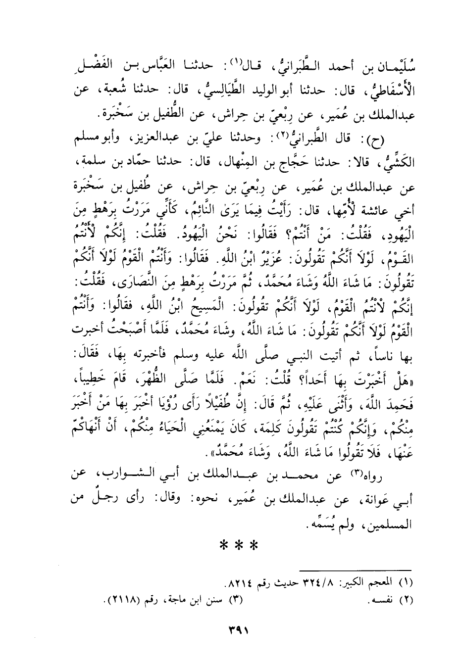(ح) : قال الطَّبَرَانِيُّ (2) : وحَدَّثَنَا علي بْن عبد العزيز، وأبو مُسْلِمٍ الْكَشِّيُّ، قَالا: حَدَّثَنَا حَجَّاجُ بْنُ الْمِنْهَالِ، قال: حَدَّثَنَا حَمَّادُ بْنُ سَلَمَةَ، عَنْ عَبد المَلِك بْنِ عُمَير، عَنْ رِبْعِيِّ بْنِ حِرَاشٍ، عَنْ طُفَيْلِ بْنِ سَخْبَرَةَ أَخِي عَائِشَةَ لأُمِّهَا، قال: رَأَيْتُ فِيمَا يَرَى النَّائِمُ، كَأَنِّي مَرَرْتُ بِرَهْطٍ مِنَ الْيَهُودِ، فَقُلْتُ: مَنْ أَنْتُمْ؟ فَقَالُوا: نَحْنُ الْيَهُودُ. فَقُلْتُ: إِنَّكُمْ لأَنْتُمُ الْقَوْمُ، لَوْلا أَنَّكُمْ تقولون: عزير ابْنُ اللَّهِ. فَقَالُوا: وأَنْتُمُ الْقَوْمُ لَوْلا أَنَّكُمْ تَقُولُونَ: مَا شَاءَ اللَّهُ وشَاءَ مُحَمَّدٌ، ثُمَّ مَرَرْتُ بِرَهْطٍ مِنَ النَّصَارَى، فَقُلْتُ: إِنَّكُمْ لأَنْتُمُ الْقَوْمُ، لَوْلا أَنَّكُمْ تَقُولُونَ: الْمَسِيحُ ابْنُ اللَّهِ، فَقَالُوا: وأَنْتُمُ الْقَوْمُ لَوْلا أَنَّكُمْ تَقُولُونَ: مَا شَاءَ اللَّهُ، وشَاءَ مُحَمَّدٌ، فَلَمَّا أَصْبَحْتُ أَخْبَرْتُ بِهَا نَاسًا، ثُمَّ أَتَيْتُ النَّبِيَّ صَلَّى اللَّهُ عَلَيْهِ وسَلَّمَ فَأَخْبَرْتُهُ بِهَا، فَقَالَ: هَلْ أَخْبَرْتَ بِهَا أَحَدًا؟ قُلْتُ: نَعَمْ.