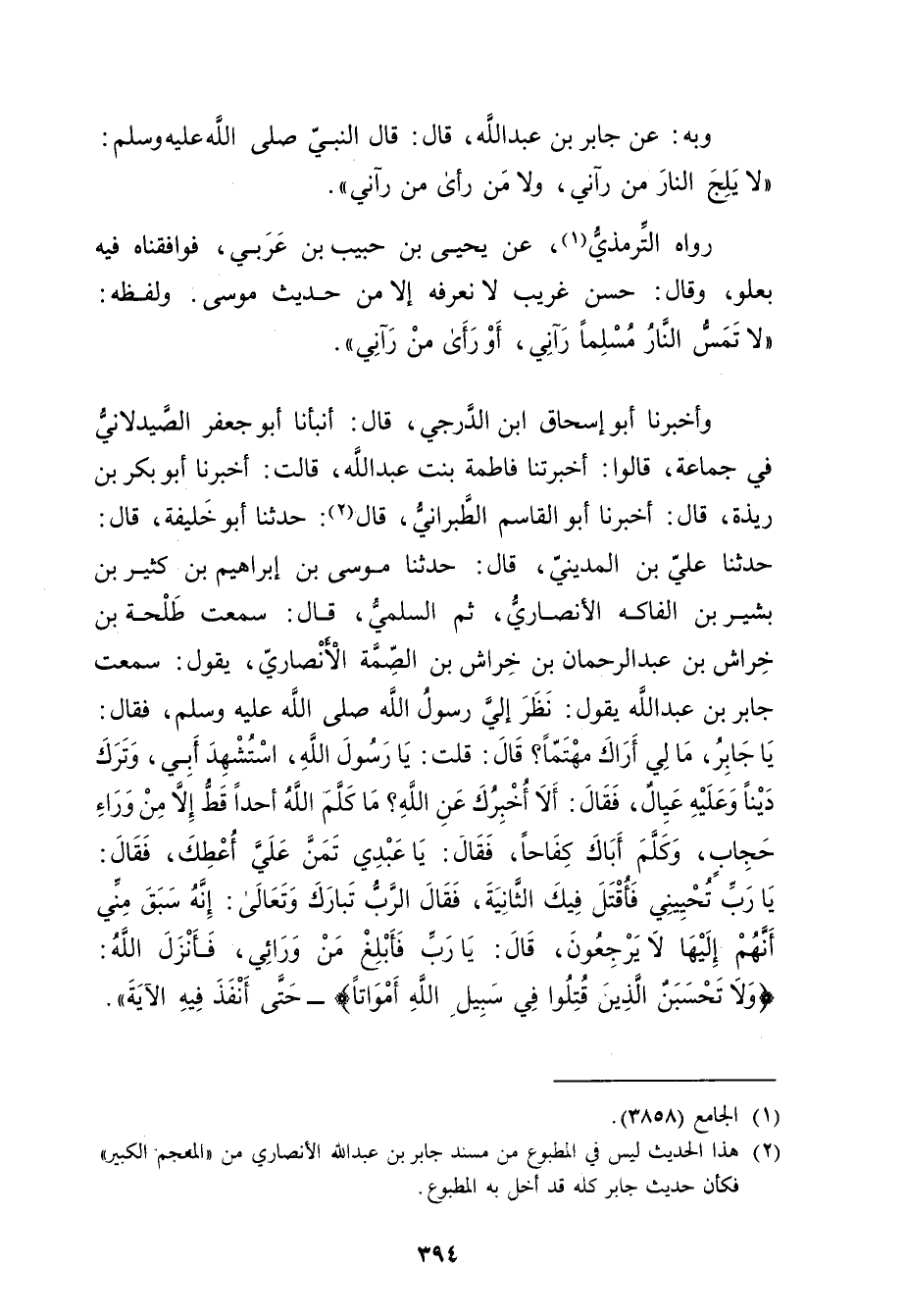 وأْخَبَرَنَا أَبُو إِسْحَاقَ ابْنُ الدَّرَجِيِّ، قال: أَنْبَأَنَا أَبُو جعفر الصَّيْدَلانِيّ فِي جماعة، قَالُوا: أَخْبَرَتْنا فَاطِمَةُ بِنْتُ عَبد اللَّهِ، قَالَتْ: أخبرنا أَبُو بَكْرِ بْنِ رِيذَةَ، قال: أخبرنا أَبُو الْقَاسِمِ الطَّبَرَانِيُّ، قال (2) : حَدَّثَنَا أَبُو خَلِيفَةَ، قال: حَدَّثَنَا عَلِيُّ بْنُ الْمَدِينِيِّ، قال: حَدَّثَنَا مُوسَى بْنُ إبراهيم بن كثير بن بشير بْنِ الْفَاكِهِ الأَنْصارِيّ، ثُمَّ السُّلَمِيُّ، قال: سَمِعْتُ طَلْحَةَ بْنَ خِرَاشِ بْنِ عَبْدِ الرَّحْمَنِ بْنِ خِرَاشِ بْنِ الصِّمَّةِ الأَنْصارِيّ، يَقُولُ: سَمِعْتُ جابر بْن عَبد اللَّهِ يَقُولُ: نَظَرَ إِلَيَّ رَسُولُ اللَّهِ صَلَّى اللَّهُ عَلَيْهِ وسَلَّمَ، فقَالَ: يا جَابِرُ، مَا لِي أَرَاكَ مُهْتَمًّا؟ قال: قُلْتُ: يَا رَسُولَ اللَّهِ، اسْتُشْهِدَ أَبِي، وتَرَكَ دَيْنًا وعَلَيْهِ عِيَالٌ، فَقَالَ: أَلا أُخْبِرُكَ عَن اللَّهِ؟ مَا كَلَّمَ اللَّهُ أَحَدًا قَطُّ إِلا مِنْ ورَاءِ حِجَابٍ، وكَلَّمَ أَبَاكَ كِفَاحًا، فَقَالَ: يَا عَبْدِي تَمَنَّ عَلَيَّ أُعْطِكَ، فَقَالَ: يَا رَبِّ تُحْيِينِي فَأُقْتَلَ فِيكَ الثَّانِيَةَ، فَقَالَ الرَّبُّ تَبَارَكَ وتَعَالَى: إِنَّهُ سَبَقَ مِنِّي أَنَّهُمْ إِلَيْهَا لا يَرْجِعُونَ، قال: يَا رَبُّ فَأَبْلِغْ مَنْ ورَائِي، فَأَنْزَلَ اللَّهُ: {ولا تَحْسَبَنَّ الَّذِينَ قُتِلُوا فِي سَبِيلِ اللَّهِ أَمْوَاتًا} - حَتَّى أَنْفَذَ فيه الآية.