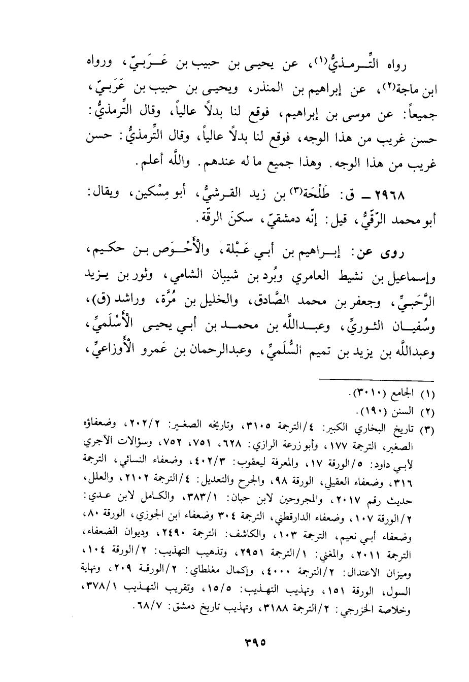 2968 - ق: طلحة بن زيد القرشي (3) ، أبو مسكين، ويُقال: أبو محمد الرَّقِّيّ، قيل: إنه دمشقي، سكن الرقة.