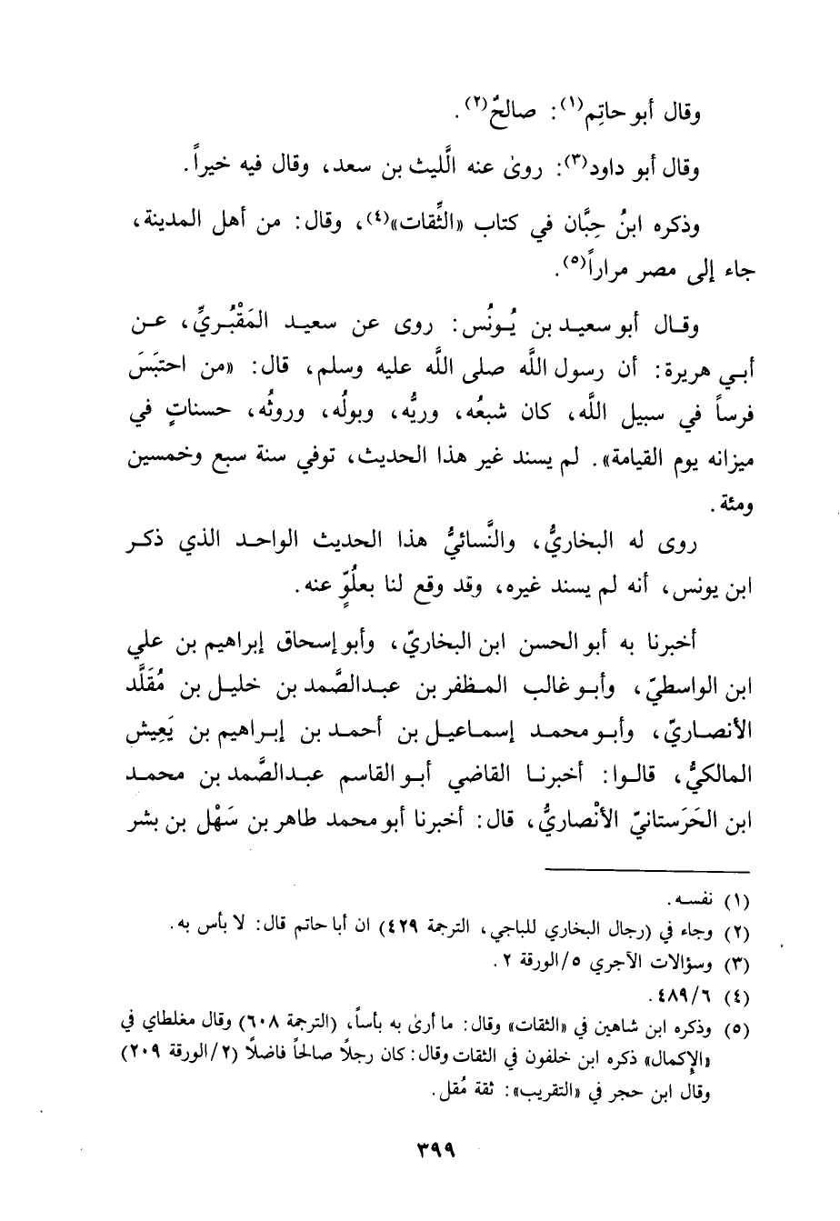 وَقَال أبو سَعِيد بن يونس: روى عن سَعِيد المقبري، عَن أَبِي هُرَيْرة: أن رَسُول اللَّهِ صَلَّى اللَّهُ عَلَيْهِ وسَلَّمَ، قال: من احتبس فرسا في سبيل الله، كان شبعه، وريه، وبوله، وروثه، حسنات في ميزانه يوم القيامة". لم يسند غير هذا الحديث، توفي سنة سبع وخمسين ومئة.