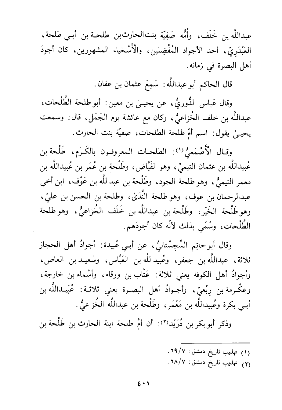 وَقَال الأَصْمَعِيّ (1) : الطلحات المعروفون بالكرم، طلحة بن عُبَيد الله بن عثمان التَّيْمِيّ، وهو الفياض، وطلحة بن عُمَر بْن عُبَيد الله بْن معمر التَّيْمِيّ، وهو طلحة الجود، وطلحة بْن عَبد الله بْن عوف، ابْن أخي عَبْد الرحمن بْن عوف، وهو طلحة الندى، وطلحة الحسن بن علي، وهو طلحة الخير، وطلحة بن عَبد الله بن خلف الخزاعي، وهو طلحة الطلحات، وسمي بذلك لأنه كان أجودهم.