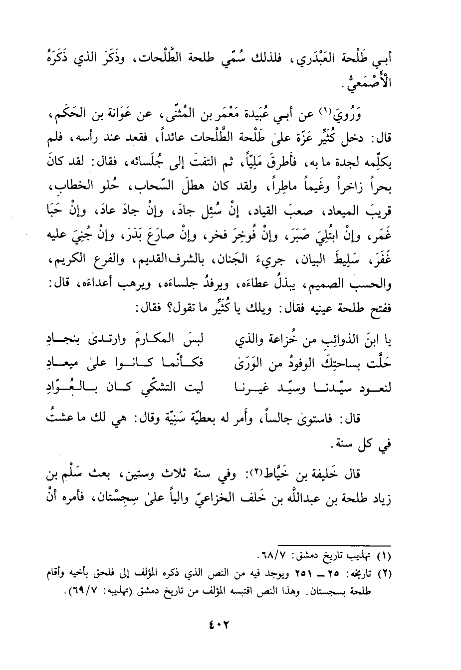 (2) تاريخه: 25 - 251 ويوجد فيه من النص الذي ذكره المؤلف إلى فلحق بأخيه وأقام طلحة بسجستان. وهذا النص اقتبسه المؤلف من تاريخ دمشق (تهذيبه: 7 / 69) .