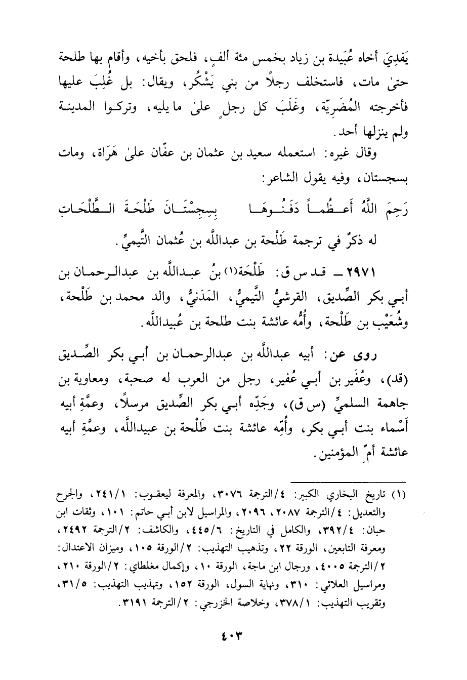 2971 - قد س ق: طلحة بْن عَبد اللَّهِ بْن عَبْد الرَّحْمَنِ بْن أَبي بَكْر الصديق (1) ، القرشي التَّيْمِيّ، المدني، والد محمد بن طلحة، وشعيب بن طلحة، وأمه عائشة بنت طلحة بن عُبَيد اللَّه.