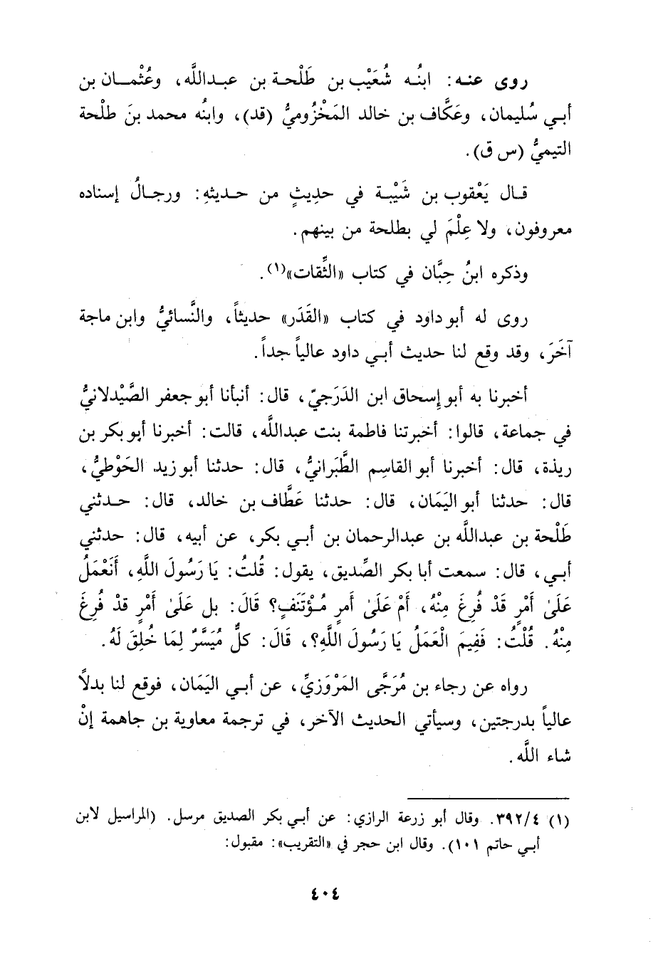 قال يعقوب بن شَيْبَة في حديث من حديثه: ورجال إسناده معروفون، ولا علم لي بطلحة من بينهم.