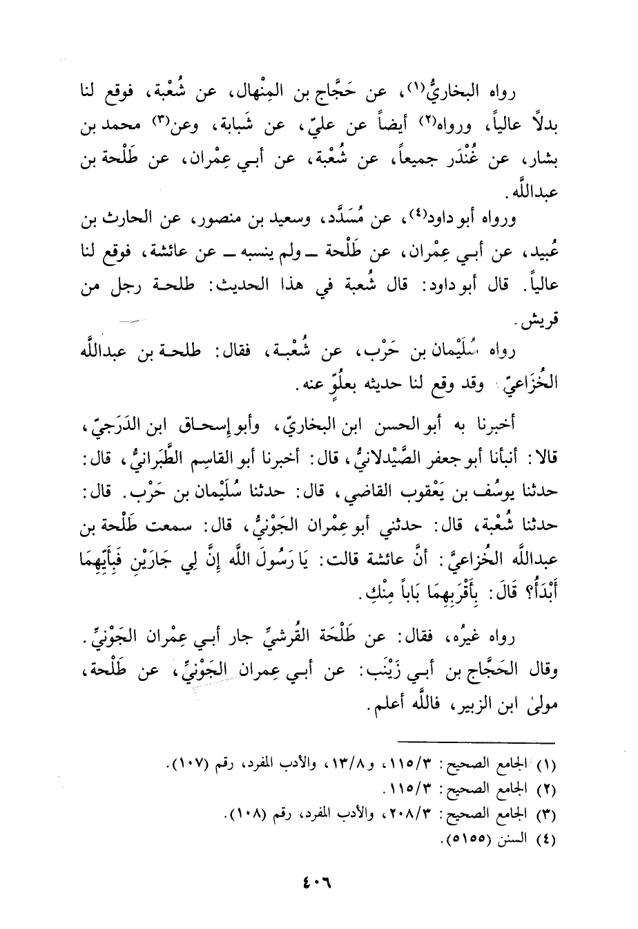 ورَوَاهُ أَبُو دَاوُدَ (4) ، عَنْ مُسَدَّدٍ، وسَعِيد بْنِ مَنْصُورٍ، عَنِ الْحَارِثِ بْن عُبَيد، عَن أبي عِمْران، عَنْ طَلْحَةَ - ولَمْ يَنْسِبْهُ، عَن عَائِشَةَ، فَوَقَعَ لَنَا عَالِيًا. قال أَبُو دَاوُدَ: قال شُعْبَةُ فِي هَذَا الْحَدِيثِ: طَلْحَةُ رَجُلٌ مِنْ قُرَيْشٍ.