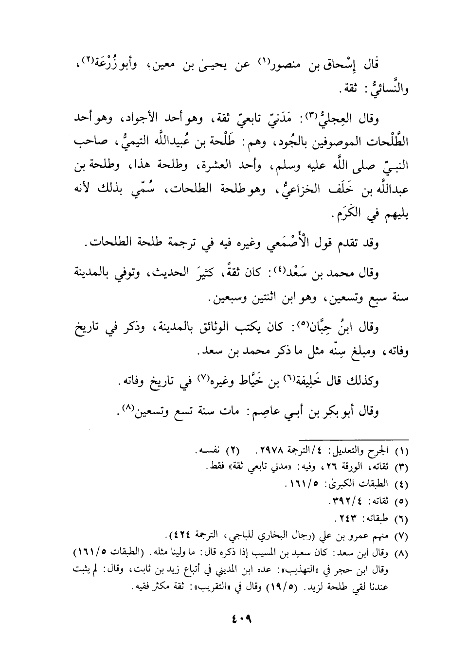 (الطبقات 5 / 161) وَقَال ابن حجر في "التهذيب": عده ابن المديني في أتباع زيد بن ثابت، وَقَال: لم يثبت عندنا لقي طلحه لزيد. (5 / 19) وَقَال في "التقريب": ثقة مكثر فقيه.