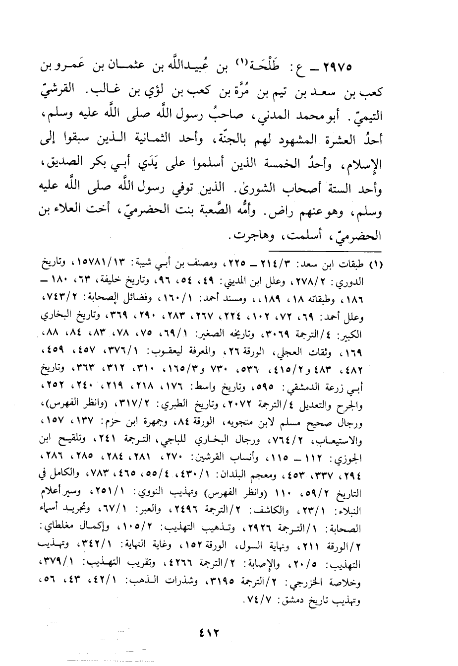 2975 - ع: طلحة بن عُبَيد الله بْن عثمان بْن عَمْرو بْن كعب بن سعد بن تيم بْن مرة بْن كعب بْن لؤي بن غالب. القرشي التَّيْمِيّ (1) . أَبُو مُحَمَّد المدني، صاحب رَسُول اللَّهِ صلى الله عليه وسلم، أحد العشرة المشهود لهم بالجنة، وأحد الثمانية الذين سبقوا إلى الإسلام، وأحد الخمسة الذين أسلموا علي يدي أبي بكر الصديق، وأحد الستة أصحاب الشورى.