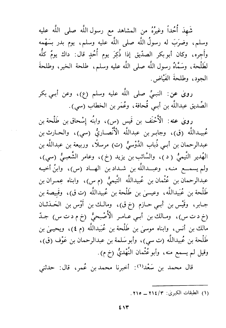 شهدا أحدا وغيره من المشاهد مع رَسُول اللَّهِ صلى الله عليه وسَلَّمَ، وضرب له رسول الله صَلَّى اللَّهُ عَلَيْهِ وسَلَّمَ، يوم بدر بسهمه وأجره، وكان أبو بكر الصديق إذا ذكر يوم أحد قال: داك يوم كله لطلحة، وسماه رسول اللَّهِ صلى الله عليه وسلم، طلحة الخير، وطلحة الجود، وطلحة الفياض.