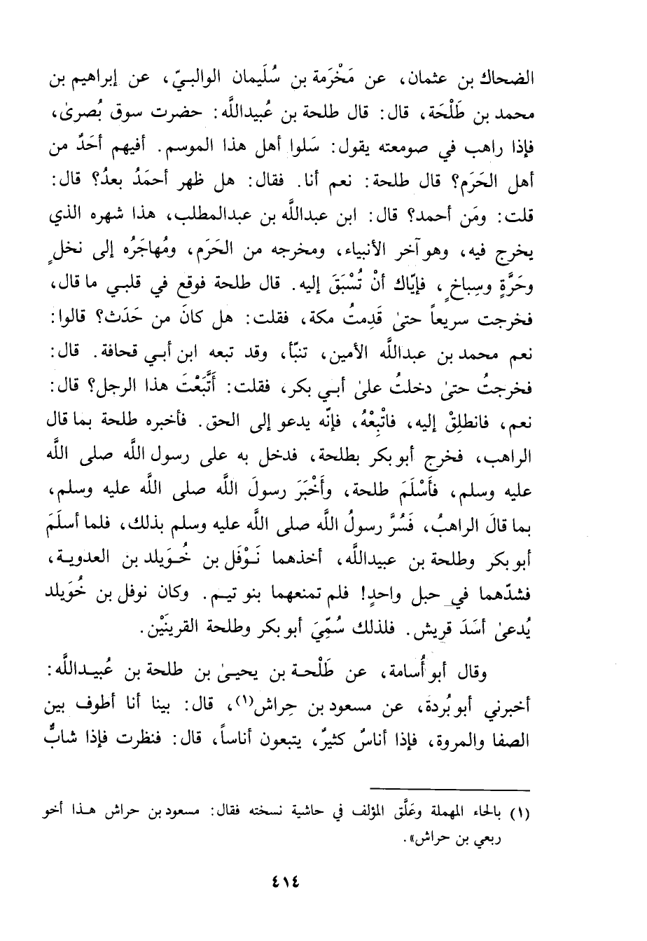 الضحاك بن عثمان، عن مخرمة بن سُلَيْمان الوالبي، عن إبراهيم بن محمد بن طلحة، قال: قال طلحة بن عُبَيد الله: حضرت سوق بصرى، فإذا راهب في صومعته يقول: سلوا أهل هذا الموسم. أفيهم أحد من أهل الحرم؟ قال طلحة: نعم أنا. فقال: هل ظهر أحمد بعد؟ قال: قلت: ومن أحمد؟ قال: ابن عَبد الله بن عبد المطلب، هذا شهره الذي يخرج فيه، وهو آخر الأنبياء، ومخرجه من الحرم، ومهاجره إلى نخل وحرة وسباخ، فإياك أن تسبق إليه. قال طلحة فوقع في قلبي ما قال، فخرجت سريعا حتى قدمت مكة، فقلت: هل كان من حدث؟ قالوا: نعم محمد بن عَبد الله الأمين، تنبأ، وقد تبعه ابن أَبي قحافة. قال: فخرجت حتى دخلت على أبي بكر، فقلت: أتبعت هذا الرجل؟ قال: نعم، فانطلق إليه، فاتبعه، فإنه يدعو إلى الحق. فأخبره طلحة بما قال الراهب، فخرج أبو بكر بطلحة، فدخل به على رسول اللَّهِ صلى الله عليه وسلم، فأسلم طلحة، وأخبر رسول الله صَلَّى اللَّهُ عليه وسلم، بما قال الراهب، فسر رسول الله صلى الله عليه وسلم بذلك، فلما أسلم أبو بكر وطلحة بن عُبَيد الله، أخذهما نوفل بن خويلد بن العدوية، فشدهما في حبل واحد! فلم تمنعهما بنو تيم.