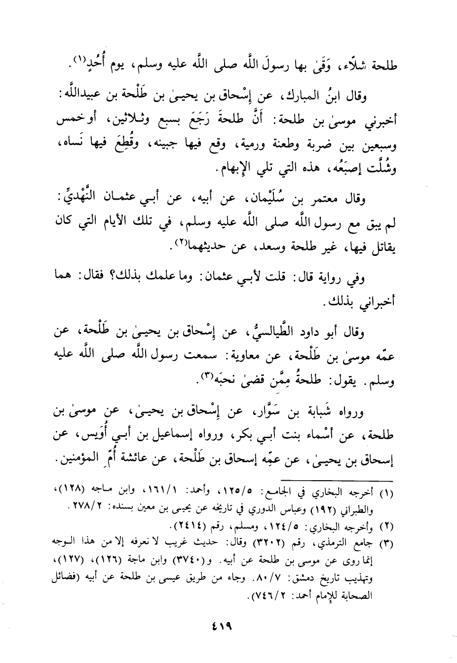 (3) جامع التِّرْمِذِيّ، رقم (3202) وَقَال: حديث غريب لا نعرفه إلا من هذا الوجه إنما روى عن موسى بْن طَلْحَة عَن أبيه. و (3740) وابن ماجة (126) ، (127) ، وتهذيب تاريخ دمشق: 7 / 80. وجاء من طريق عيسى بن طلحة عَن أبيه (فضائل الصحابة للامام أحمد: 2 / 746) .
