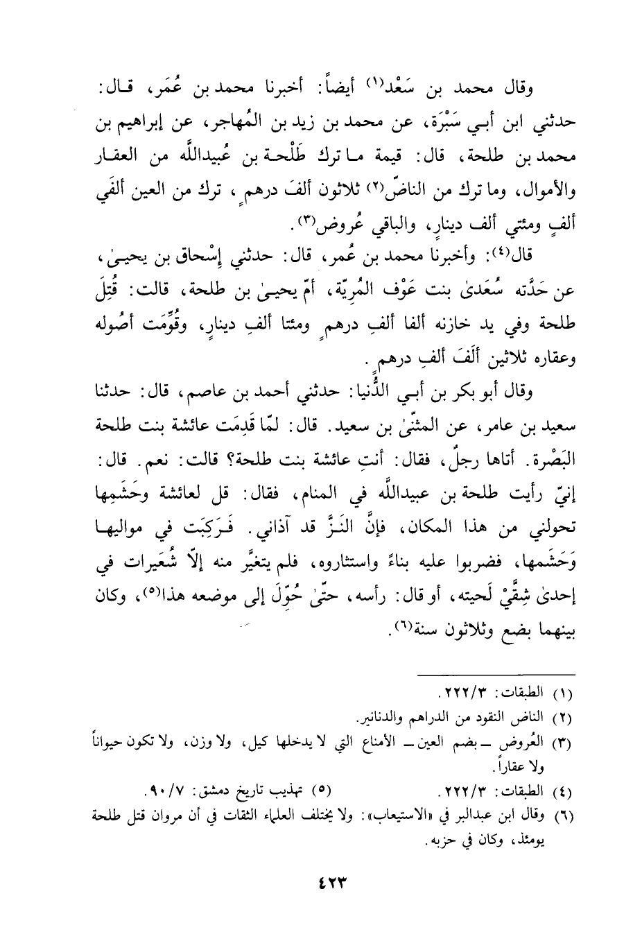 قال (4) : وأخبرنا محمد بن عُمَر، قال: حدثني إسحاق بن يحيى، عن حدته سعدى بنت عوف المرية، أم يحيى بن طلحة، قالت: قتل طلحة وفي يد خازنه ألفا ألف درهم ومئتا ألف دينار، وقومت أصوله وعقاره ثلاثين ألف ألف درهم.