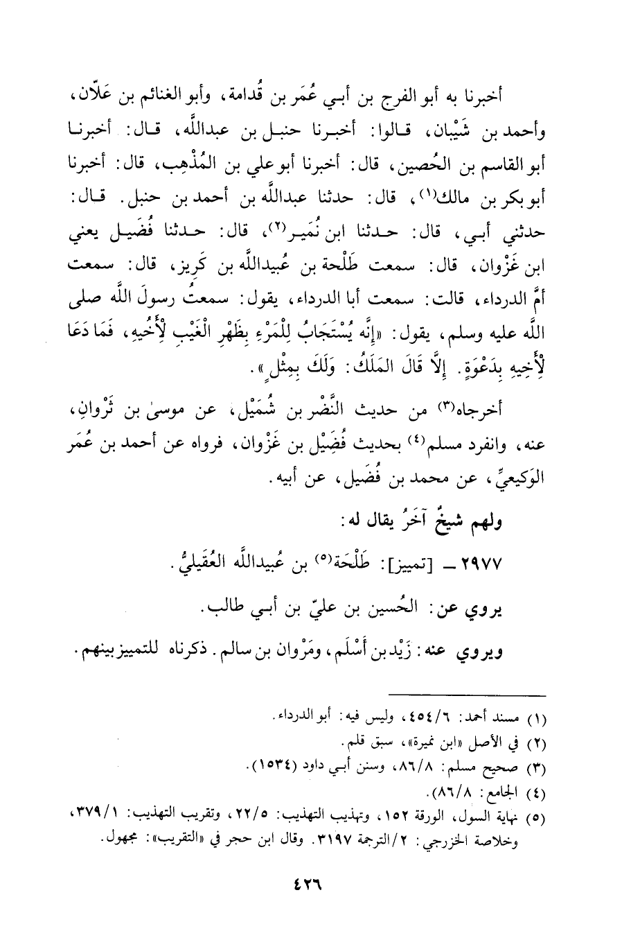 أَخْبَرَنَا بِهِ أَبُو الْفَرَجِ بْنُ أَبي عُمَر بْن قدامة، وأبو الغنائم بْن علان، وأحمد بْن شَيْبَانَ، قَالُوا: أَخْبَرَنَا حَنْبَلُ بْنُ عَبد اللَّهِ، قال: أخبرنا أَبُو القاسم بْن الحصين، قال: أَخْبَرَنَا أبو علي بْن المذهب، قال: أَخْبَرَنَا أبو بكر بْن مالك (1) ، قال: حَدَّثَنَا عَبد اللَّهِ بْن أحمد بْن حنبل. قال: حَدَّثني أَبِي، قال: حَدَّثَنَا ابْنُ نُمَيْرٍ (2) ، قال: حَدَّثَنَا فضيل يعني ابن غَزْوَانَ، قال: سَمِعْتُ طَلْحَةَ بْنَ عُبَيد اللَّهِ بْنِ كَرِيزٍ، قال: سَمِعْتُ أُمَّ الدَّرْدَاءِ، قَالَتْ: سَمِعْتُ أَبَا الدَّرْدَاءِ، يَقُولُ: سَمِعْتُ رَسُولَ اللَّهِ صلى الله عليه وسلم، يَقُولُ: إِنَّهُ يُسْتَجَابُ لِلْمَرْءِ بِظَهْرِ الْغَيْبِ لأَخِيهِ، فَمَا دَعَا لأَخِيهِ بِدَعْوَةٍ. إِلا قال الْمَلَكُ: ولَكَ بِمِثْلٍ.