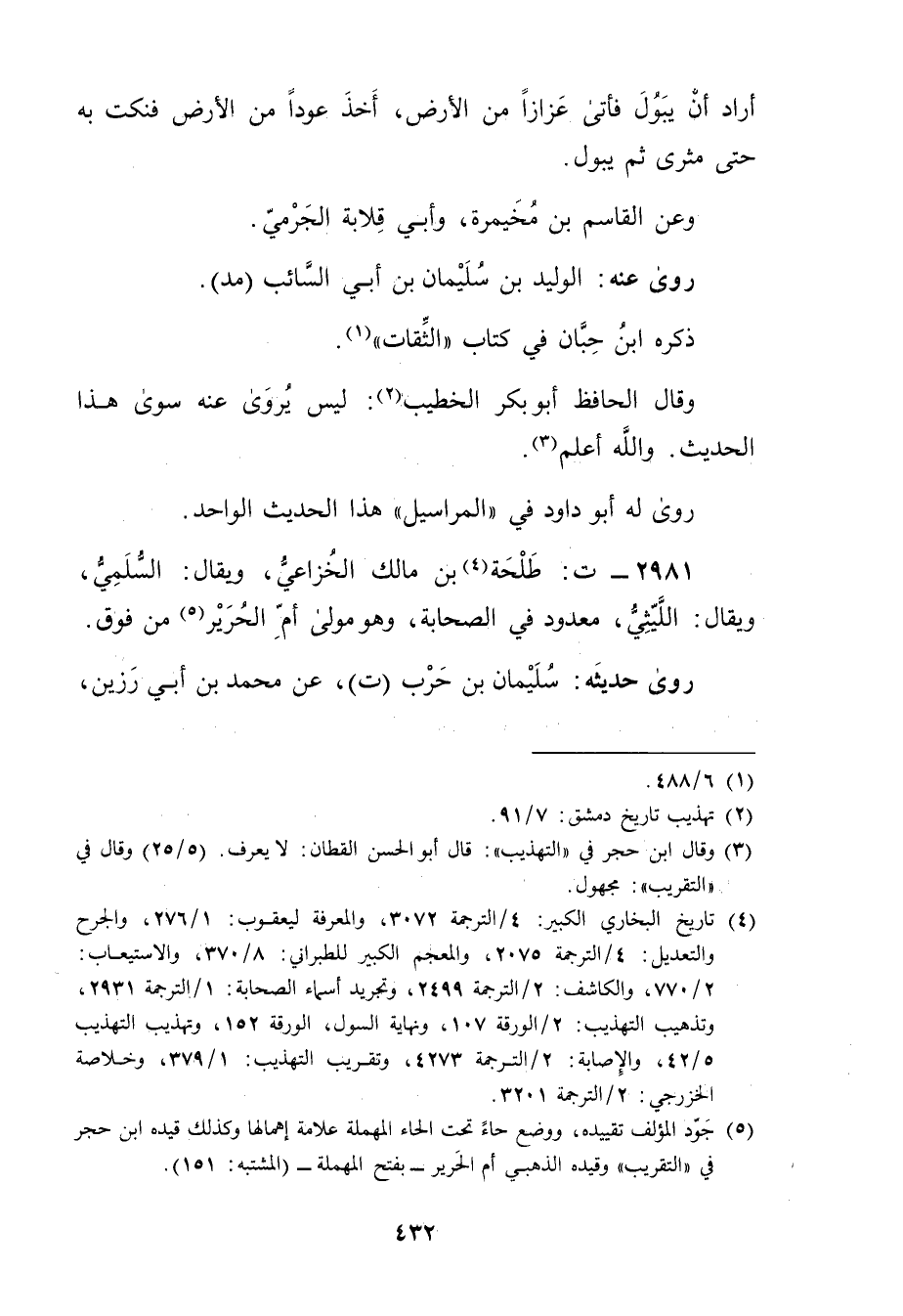 2981 - ت: طلحة بن مالك الخزاعي (4) ، ويُقال: السلمي، ويُقال: الليثي، معدود في الصحابة، وهو مولى أم الحرير (5) من فوق.