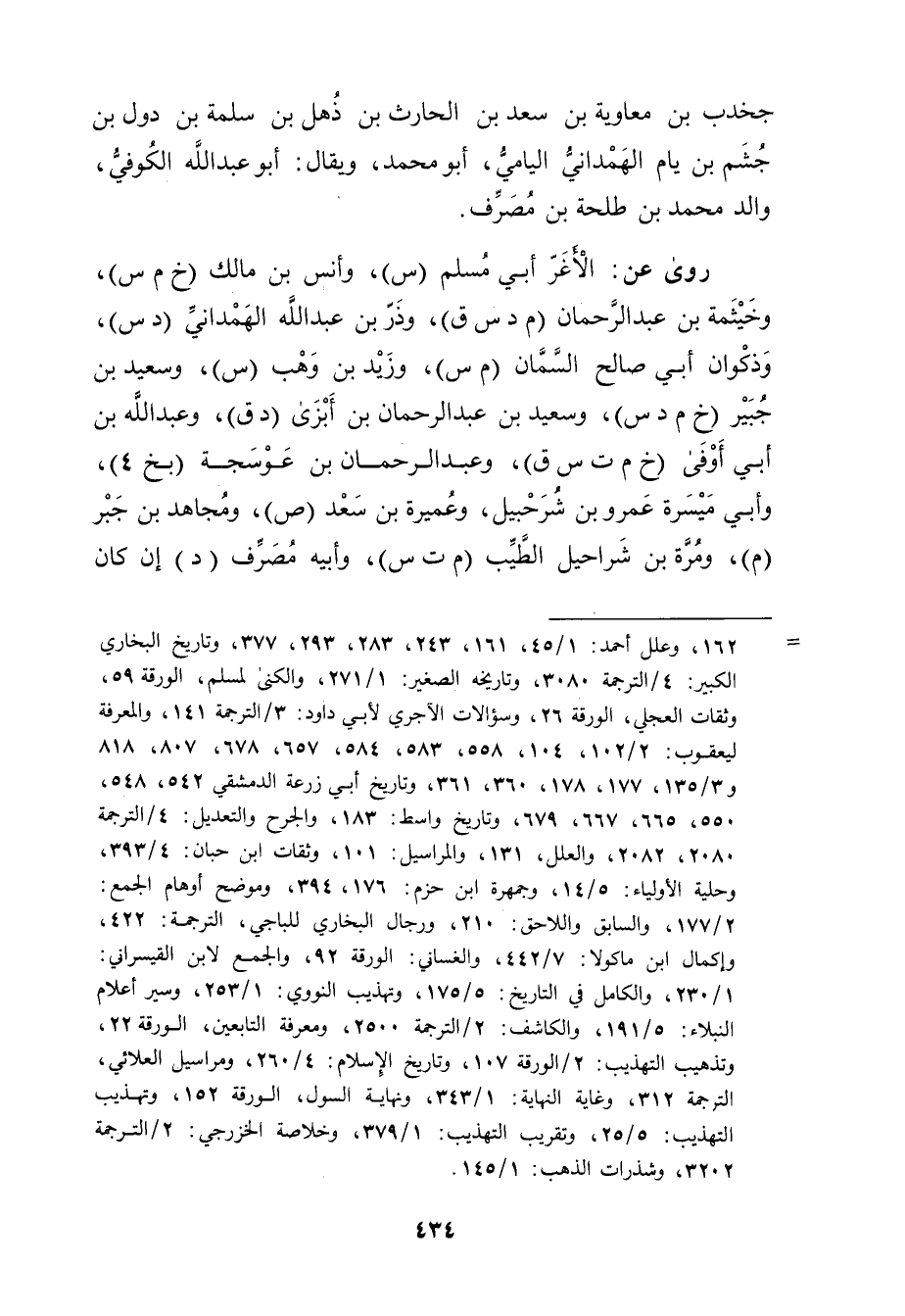 = 162، وعلل أحمد: 1 / 45، 161، 243، 283، 293، 377، وتاريخ البخاري الكبير: 4 / الترجمة 3080، وتاريخه الصغير: 1 / 271، والكنى لمسلم، الورقة 59، وثقات العجلي، الورقة 26، وسؤالات الآجري لابي داود: 3 / الترجمة 141، والمعرفة ليعقوب: 2 / 102، 104، 558، 583، 584، 657، 678، 807، 818 و3 / 135، 177، 178، 360، 361، وتاريخ أبي زرعة الدمشقي 542، 548، 550، 665، 667، 679، وتاريخ واسط: 183، والجرح والتعديل: 4 / الترجمة 2080، 2082، والعلل، 131، والمراسيل: 101، وثقات ابن حبان: 4 / 393، وحلية الاولياء: 5 / 14، وجمهرة ابن حزم: 176، 394، وموضح أوهام الجمع: 2 / 177، والسابق واللاحق: 210، ورجال البخاري للباجي، الترجمة: 422، وإكمال ابن ماكولا: 7 / 442، والغساني: الورقة 92، والجمع لابن القيسراني: 1 / 230، والكامل في التاريخ: 5 / 175، وتهذيب النووي: 1 / 253، وسير أعلام النبلاء: 5 / 191، والكاشف: 2 / الترجمة 2500، ومعرفة التابعين، الورقة 22، وتذهيب التهذيب: 2 / الورقة 107، وتاريخ الاسلام: 4 / 260، ومراسيل العلائي، الترجمة 312، وغاية النهاية: 1 / 343، ونهاية السول، الورقة 152، وتهذيب التهذيب: 5 / 25، وتقريب التهذيب: 1 / 379، وخلاصة الخزرجي: 2 / الترجمة 3202، وشذرات الذهب: 1 / 145.