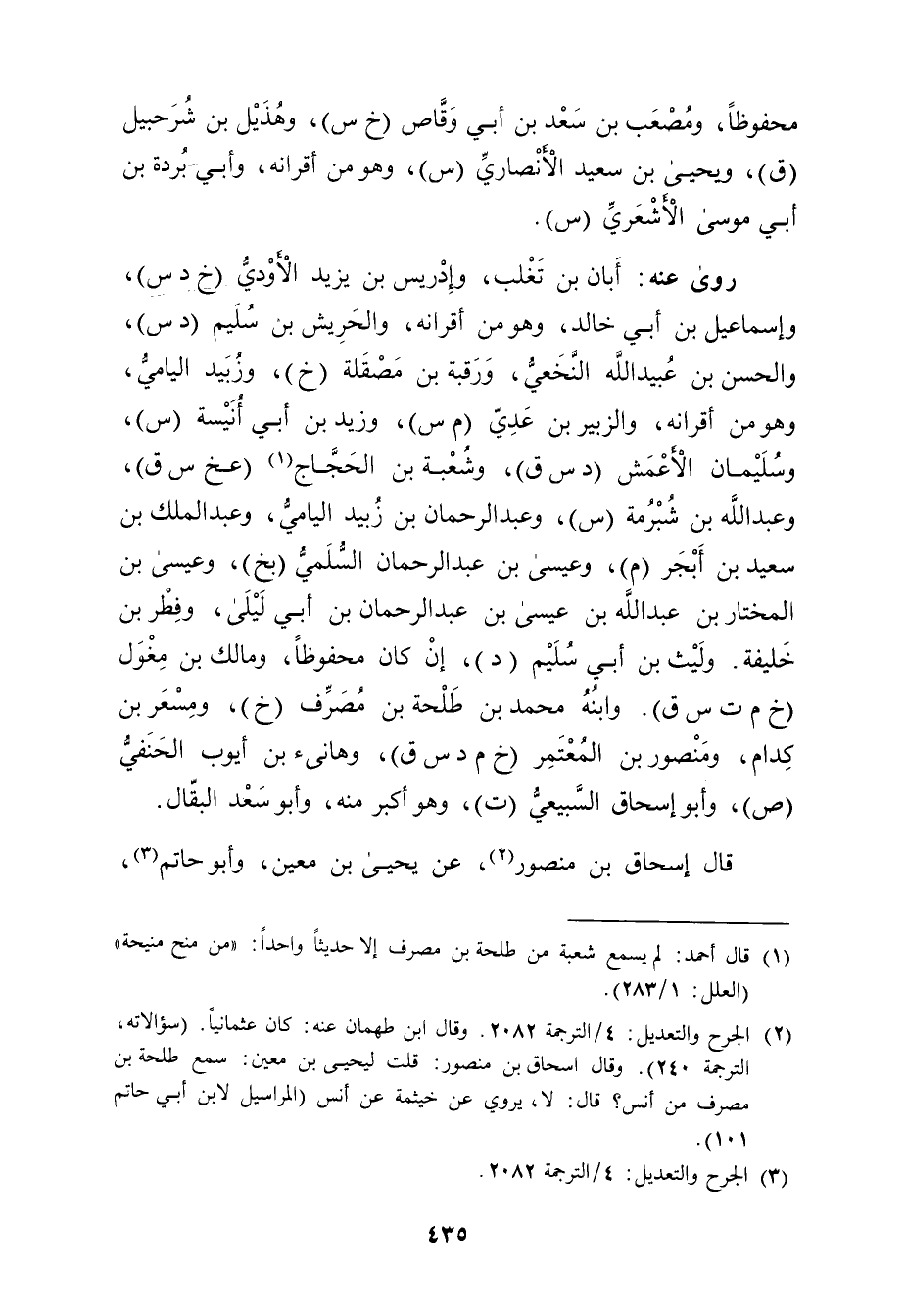 (2) الجرح والتعديل: 4 / الترجمة 2082. وَقَال ابن طهمان عَنه: كان عثمانيا. (سؤالاته، الترجمة 240) . وَقَال إسحاق بن منصور: قلت ليحيى بن مَعِين: سمع طلحة بن مصرف من أنس؟ قال: لا، يروي عن خيثمة عن أنس (المراسيل لابن أَبي حاتم 101) .