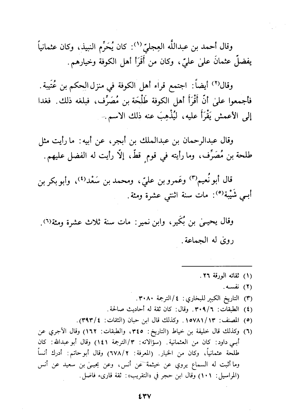 (6) وكذلك قال خليفة بْن خياط (التاريخ: 345، والطبقات: 162) وَقَال الآجري عَن أبي دَاوُد: كان من العثمانية. (سؤالاته: 3 / الترجمة 141) وَقَال أبو عبد الله: كان طلحة عثمانيا، وكان من الخيار. (المعرفة: 2 / 678) وَقَال أبو حاتم: أدرك أنسا وما أثبت له السماع يروي عن خيثمة عن أنس، وعن يَحْيَى بْنُ سَعِيد عَنْ أَنَسِ (المراسيل: 101) وَقَال ابن حجر في "التقريب": ثقة قارئ فاضل.
