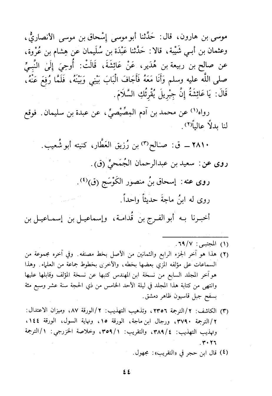 موسى بْن هارون، قال: حَدَّثَنَا أبو موسى إسحاق بْن موسى الأَنْصارِيّ، وعثمان بن أَبي شَيْبَة، قالا: حَدَّثَنَا عبدة بن سُلَيْمان عَنْ هِشَامِ بْنِ عُرْوَةَ، عَنْ صالح بن ربيعة بن هدير، عن عائشة، قالت: أوحي إلى النَّبِيُّ صلى الله عليه وسلم وأنا معه فأجاف الباب بيني وبينه، فلما رفع عنه، قال: يا عائشة إن جبريل يقرئك السَّلامُ.