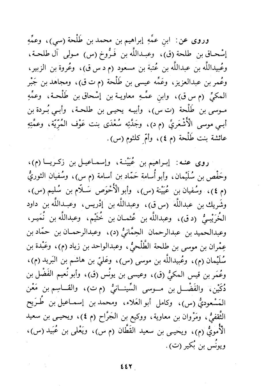 ورَوَى عَن: ابن عمه إبراهيم بن محمد بن طلحة (سي) ، وعمه إسحاق بن طلحة (ق) ، وعبد الله بن فروخ (س) مولى آل طلحة، وعُبَيد الله بْن عَبد الله بْن عتبة بن مسعود (م د س ق) ، وعروة بن الزبير، وعُمَر بن عبد العزيز، وعمه عيسى بن طلحة (م ت ق) ، ومجاهد بن جبر المكي (م س ق) ، وابن عمه معاوية بن إسحاق بن طلحة، وعمه موسى بن طلحة (ت س) ، وأبيه يحيى بن طلحة، وأبي بردة بْن أَبي موسى الأشعري (م د) ، وجدته سعدى بنت عوف المرية، وعمته عائشة بنت طلحة (م 4) ، وأم كلثوم (س) .