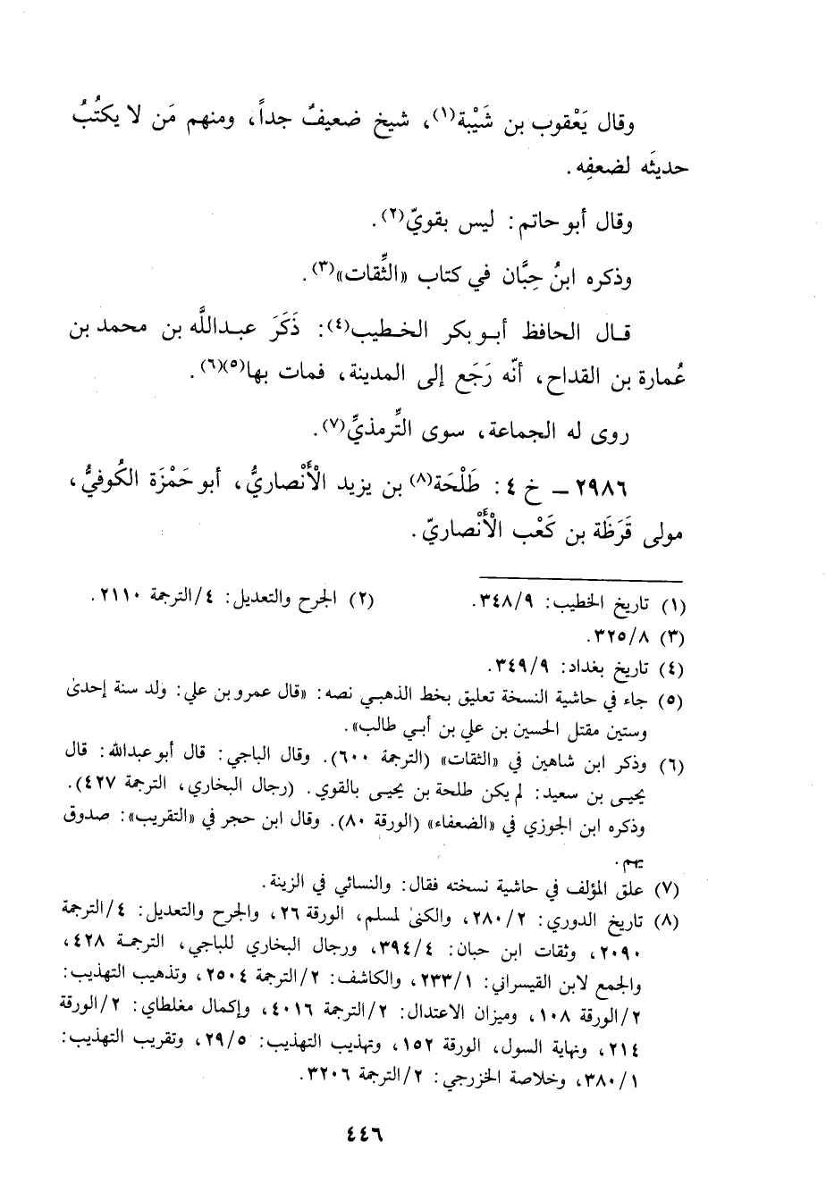 2986 - خ 4: طلحة بن يزيد الأَنْصارِيّ (8) ، أبو حمزة الكوفي، مولى قرظة بن كعب الأَنْصارِيّ.