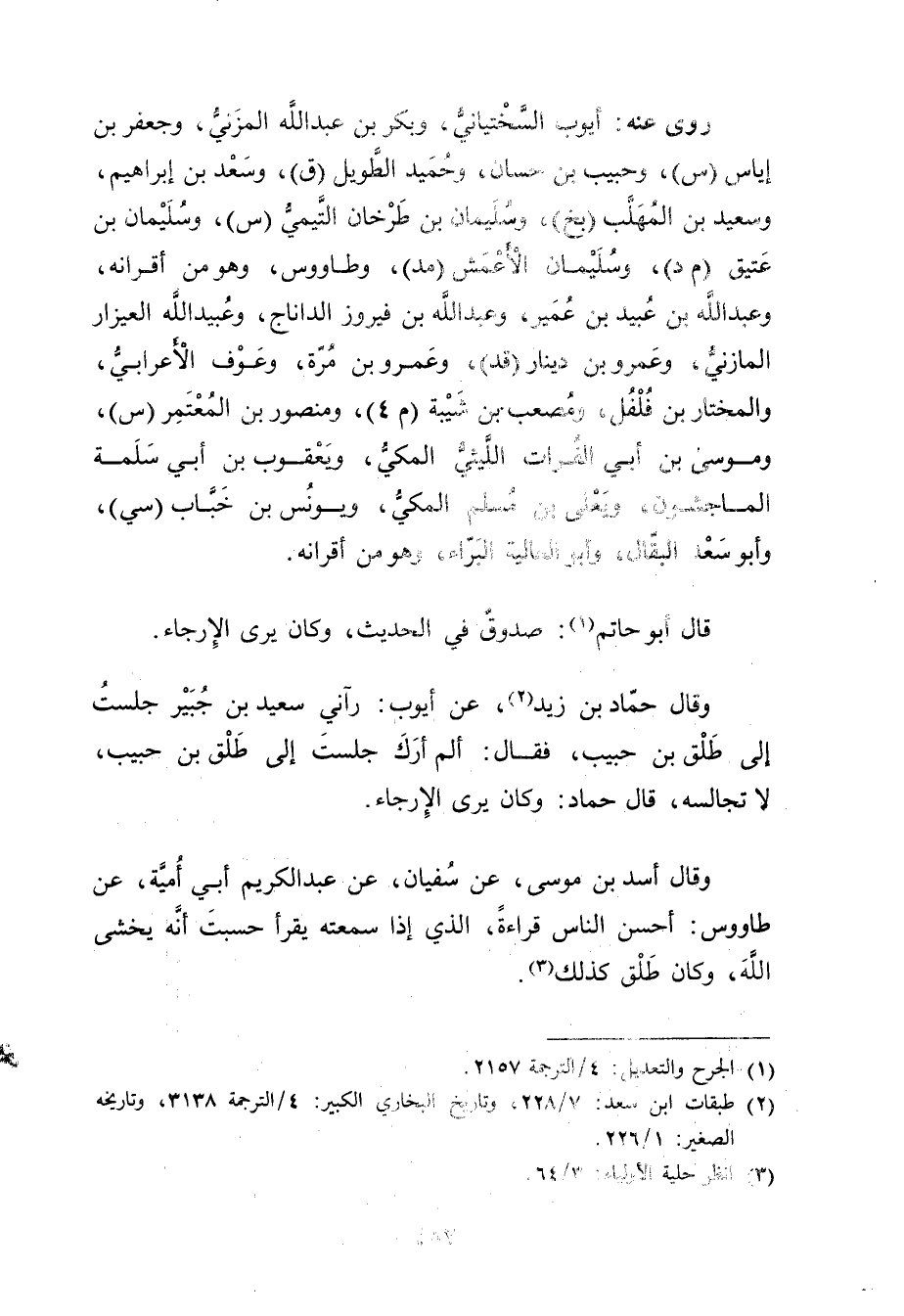وَقَال حماد بْن زيد (2) ، عن أيوب: رآني سَعِيد بن جبير جلست إلى طلق بن حبيب، فقال: ألم أرك جلست إلى طلق بن حبيب، لا تجالسه، قال حماد: وكان يرى الإرجاء.