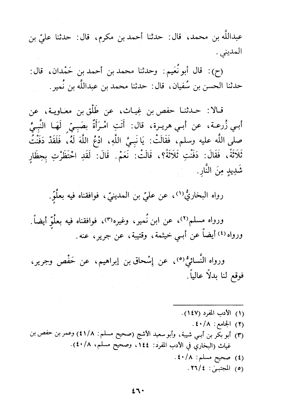 ورَوَاهُ النَّسَائي (5) ، عَنْ إِسْحَاقَ بْنِ إِبْرَاهِيمَ، عَنْ حَفْصٍ وجَرِيرٍ، فَوَقَعَ لَنَا بَدَلا عَالِيًا.
