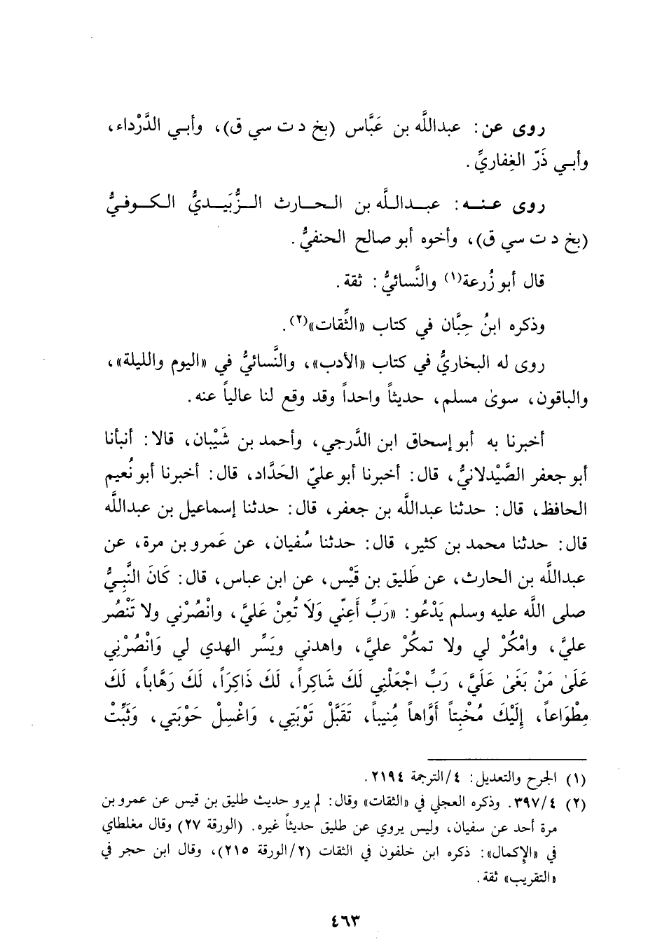 أَخْبَرَنَا بِهِ أَبُو إِسْحَاقَ ابْنُ الدَّرَجِيِّ، وأَحْمَدُ بْنُ شَيْبَانَ، قالا: أَنْبَأَنَا أَبُو جَعْفَرٍ الصَّيْدَلانِيُّ، قال: أَخْبَرَنَا أَبُو عَلِيّ الحداد، قال: أَخْبَرَنَا أَبُو نعيم الحافظ، قال: حَدَّثَنَا عَبد اللَّهِ بْنُ جَعْفَرٍ، قال: حَدَّثَنَا إِسْمَاعِيلُ بْنُ عَبد اللَّهِ قال: حَدَّثَنَا مُحَمَّدُ بْنُ كَثِيرٍ، قال: حَدَّثَنَا سُفْيَانُ، عَنْ عَمْرو بْنِ مرة، عَنْ عَبد اللَّهِ بْن الْحَارِثِ، عَنْ طَلِيقِ بْنِ قَيْسٍ، عَنِ ابْنِ عَبَّاسٍ، قال: كَانَ النَّبِيُّ صلى الله عليه وسلم يَدْعُو: رَبِّ أَعِنِّي ولا تُعِنْ عَلَيَّ، وانْصُرْنِي ولا تَنْصُرْ عَلَيَّ، وامْكُرْ لِي ولا تَمْكُرْ عَلَيَّ، واهْدِنِي ويَسِّرِ الْهُدَى لِي وانْصُرْنِي عَلَى مَنْ بَغَى عَلَيَّ، رَبِّ اجْعَلْنِي لَكَ شَاكِرًا، لَكَ ذَاكِرًا، لَكَ رَهَّابًا، لَكَ مِطْوَاعًا، إِلَيْكَ مُخْبِتًا أَوَّاهًا مُنِيبًا، تَقَبَّلْ تَوْبَتِي، واغسل حوبتي، وثبت