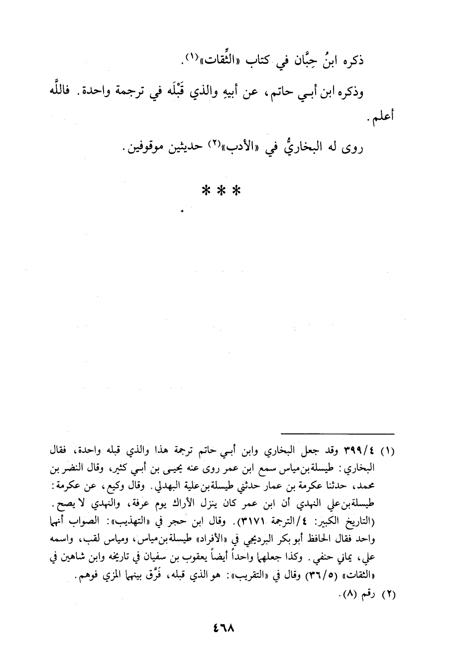 (1) 4 / 399 وقد جعل البخاري وابن أَبي حاتم ترجمة هذا والذي قبله واحدة، فقال البخاري: طيسلة بن مياس سمع ابن عُمَر روى عنه يحيى بن أَبي كثير، وَقَال النضر بن محمد، حَدَّثَنَا عكرمة بن عمار حدثني طيسلة بن علية البهدلي. وَقَال وكيع، عن عكرمة: طيسلة بن علي النهدي أن ابن عُمَر كان ينزل الاراك يوم عرفة، والنهدي لا يصح. (التاريخ الكبير: 4 / الترجمة 3171) . وَقَال ابن حجر في "التهذيب": الصواب أنهما واحد فقال الحافظ أبو بكر البرديجي في "الافراد"طيسلة بن مياس، ومياس لقب، واسمه علي، يماني حنفي. وكذا جعلهما واحدًا أيضا يعقوب بن سفيان في تاريخه وابن شاهين في "الثقات" (5 / 36) وَقَال في "التقريب": هو الذي قبله، فرق بينهما المزي فوهم.