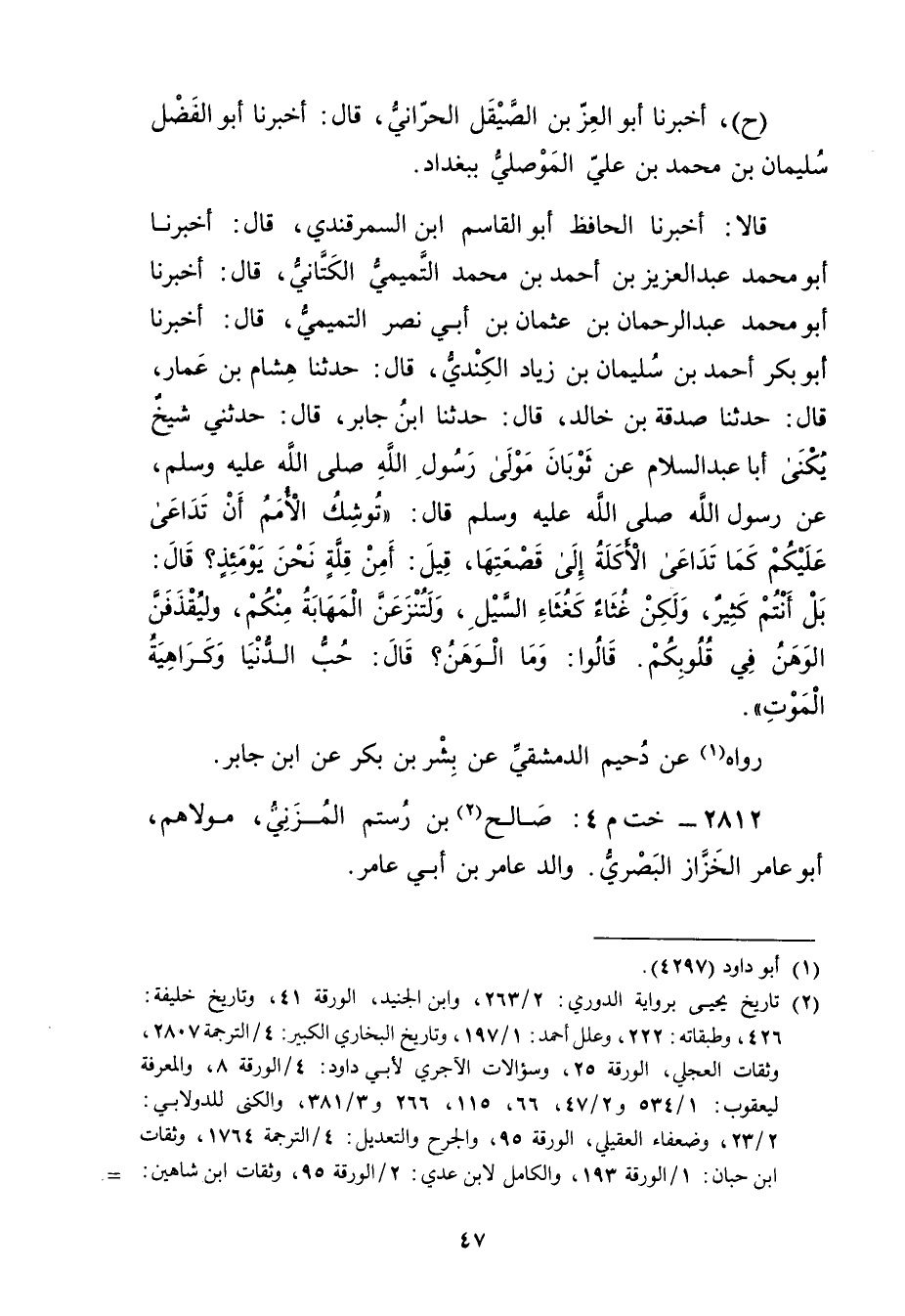 قَالا: أَخْبَرَنَا الحافظ أبو القاسم ابْنِ السَّمَرْقَنْدِيِّ، قال: أَخْبَرَنَا أَبُو مُحَمَّدٍ عَبْدُ الْعَزِيزِ بْنُ أَحْمَدَ بْنِ مُحَمَّدٍ التَّمِيمِيُّ الْكَتَّانِيُّ، قال: أَخْبَرَنَا أَبُو مُحَمَّد عبد الرحمن بْنُ عُثْمَانَ بْنِ أَبي نَصْرٍ التميمي، قال: أَخْبَرَنَا أبو بكر أَحْمَدُ بْنُ سُلَيْمان بْنِ زِيَادٍ الْكِنْدِيُّ، قال: حَدَّثَنَا هِشَامُ بْنُ عَمَّارٍ، قال: حَدَّثَنَا صَدَقَةُ بْنُ خَالِدٍ، قال: حَدَّثَنَا ابْنُ جَابِرٍ، قال: حَدَّثَنِي شَيْخٌ يُكَنَّى أَبَا عَبْدِ السَّلامِ عَنْ ثَوْبَانَ مَوْلَى رَسُول اللَّهِ صلى الله عليه وسَلَّمَ، عَنْ رَسُولِ اللَّهِ صَلَّى اللَّهُ عَلَيْهِ وسَلَّمَ قال: تُوشِكُ الأُمَمُ أَنْ تَدَاعَى عَلَيْكُمْ كَمَا تَدَاعَى الأَكَلَةُ إِلَى قَصْعَتِهَا، قِيلَ: أَمِنْ قِلَّةٍ نَحْنُ يَوْمَئِذٍ؟ قال: بَلْ أَنْتُمْ كَثِيرٌ، ولَكِنْ غُثَاءٌ كغثاء السيل، ولتنزعن الْمَهَابَةُ مِنْكُمْ، ولَيُقْذَفَنَّ الْوَهَنُ فِي قُلُوبِكُمْ. قَالُوا: ومَا الْوَهَنُ؟ قال: حُبُّ الدُّنْيَا وكَرَاهِيَةُ الْمَوْتُ.