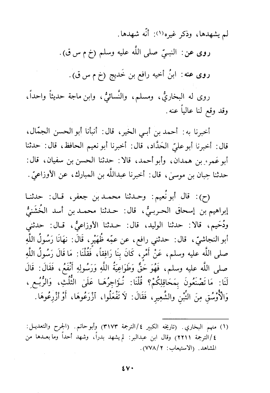 (ح) : قال أَبُو نُعَيْمٍ: وحَدَّثَنَا مُحَمَّدُ بْنِ جَعْفَرٍ، قال: حَدَّثَنَا إِبْرَاهِيمُ بْن إِسْحَاقَ الحربي، قال: حَدَّثَنَا مُحَمَّدُ بْنُ أَسَدٍ الْخُشَنِيُّ ودُحَيْمٌ، قَالا: حَدَّثَنَا الْوَلِيدُ، قال: حَدَّثَنَا الأَوزاعِيّ، قال: حَدَّثَنِي أَبُو النَّجَاشِيِّ، قال: حَدَّثَنِي رَافِعُ، عَنْ عَمِّهِ ظُهَيْرٍ، قال: نَهَانَا رَسُولُ اللَّهِ صَلَّى اللَّهُ عَلَيْهِ وسَلَّمَ، عَن أَمْرٍ، كَانَ بِنَا رَافِقًا، فَقُلْنَا: ما قال رَسُول اللَّهِ صَلَّى اللَّهُ عَلَيْهِ وسَلَّمَ، فَهُوَ حَقٌّ وطَوَاعِيَةُ اللَّهِ ورَسُولِهِ أَنْفَعُ، فَقَالَ: قال لَنَا: مَا تَصْنَعُونَ بِمَحَاقِلِكُمْ؟ قُلْنَا: نُؤَاجِرُهَا عَلَى الثُّلُثِ، والرُّبُعِ، والأَوْسُقِ مِنَ التِّبْنِ والشَّعِيرِ، فَقَالَ: لا تَفْعَلُوا، ازْرَعُوهَا، أَوْ أَزْرِعُوهَا.