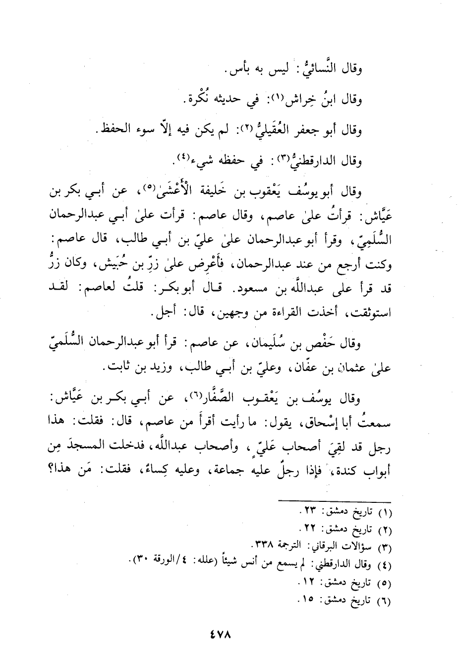 وَقَال أبو يوسف يعقوب بن خليفة الأعشى (5) ، عَن أبي بكر بن عياش، قرأت على عاصم، وَقَال عاصم: قرأت على أبي عبد الرحمن السلمي، وقرأ أبو عبد الرحمن على علي بن أَبي طالب، قال عاصم: وكنت أرجع من عند عبد الرحمن، فأعرض على زر بن حبيش، وكان زر قد قرأ على عَبد الله بْن مسعود. قال أبو بكر: قلت لعاصم: لقد استوثقت، أخذت القراءة من وجهين، قال: أجل.